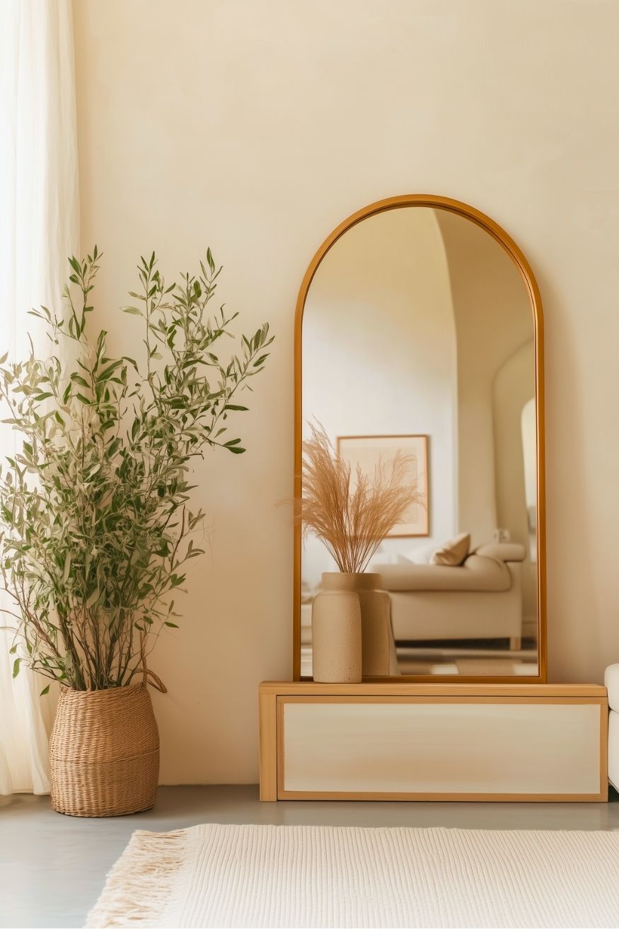 How about a decor idea that doesn’t need to hang up many things? This arched mirror softens the room and bounces light around without adding visual clutter. Paired with the greenery and natural textures, everything feels lighter and more open. It’s a simple setup, but it makes the whole space feel refreshed and breathable.