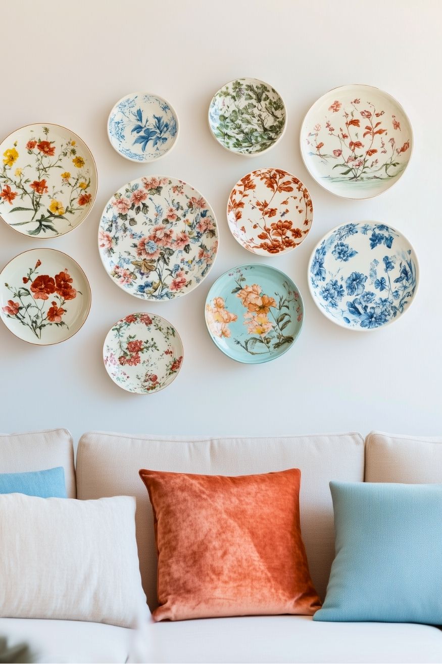 Here’s a bold, new idea that could impress anyone. The dish display is almost like an artwork with a bit of history behind each. What makes it work is the balance. Different sizes and colors of dishes make the room interesting, and the spacing and neutral wall give everything room to breathe.