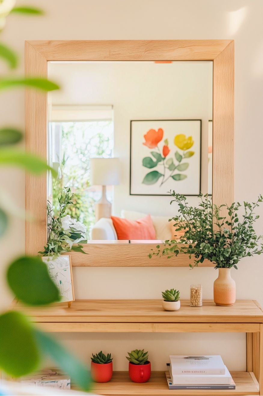Having a mirror in your living room not only makes your place feel bright but also makes it look broader. The greenery keeps everything feeling alive and spring-ready. I can tell the balance between structure and softness works best here. Clean lines from the console and mirror frame give it order, and the plants just add that relaxed, organic touch.