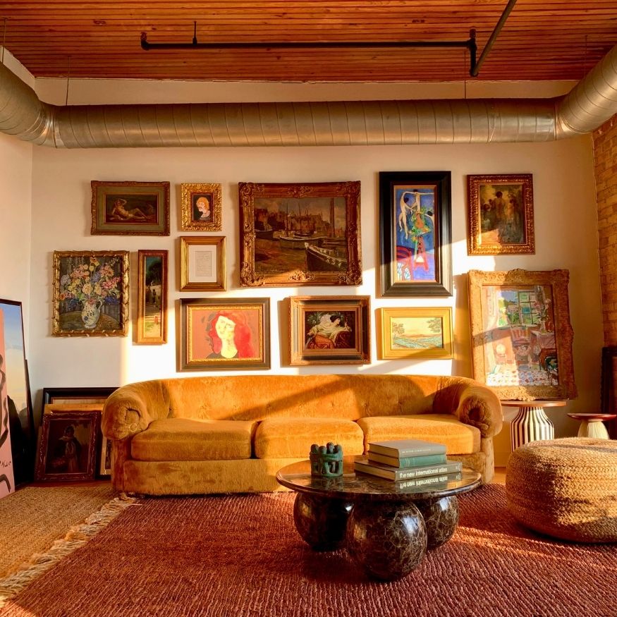 Al_Charles’s loft in Chicago honestly feels like walking into a lived-in art gallery. The oversized art wall is the whole personality here: dramatic frames, big pieces, and even a special handwritten letter artwork that makes the space feel curated instead of staged. I also love that the sunlight finally shows up as the final touch for the whole stunning setup.