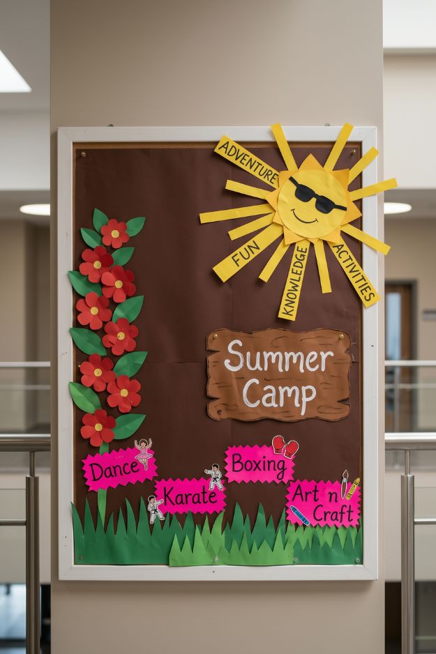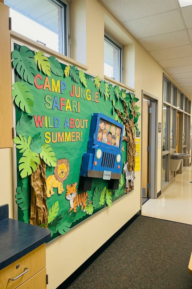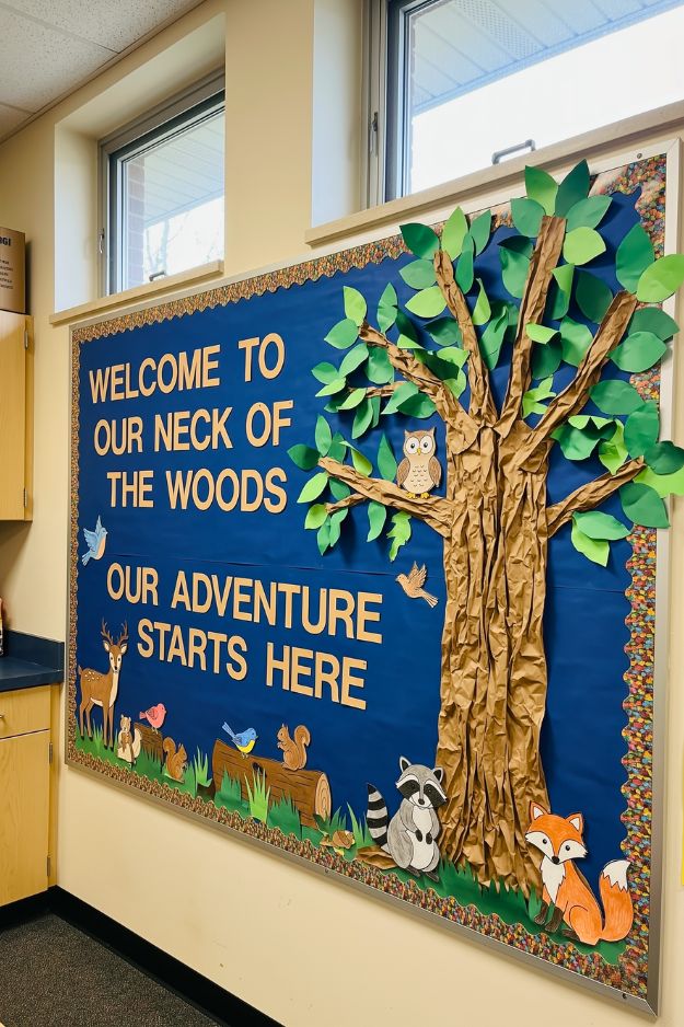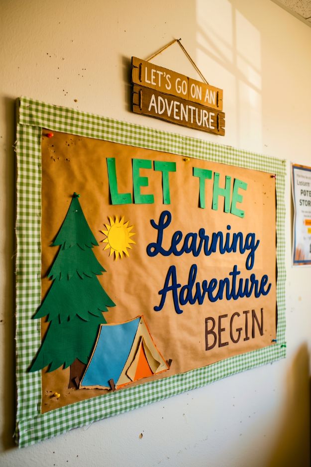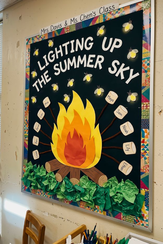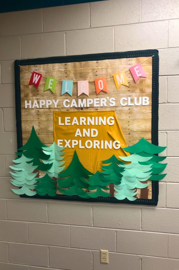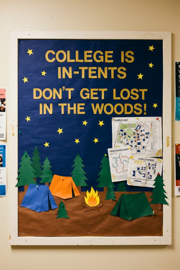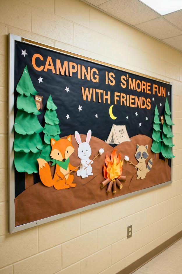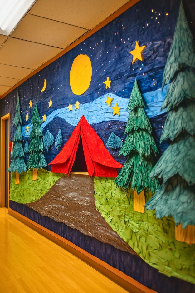 The texture on this board is insane. Crumpling up paper for the sky and grass gives it a depth you rarely see on bulletin boards. I’m completely stealing the idea of integrating actual fairy lights into the background; it makes the starry night feel so much more alive. That red paper tent is the perfect bold focal point against the deep blue and textured green. It feels totally custom and artisanal, which I love.