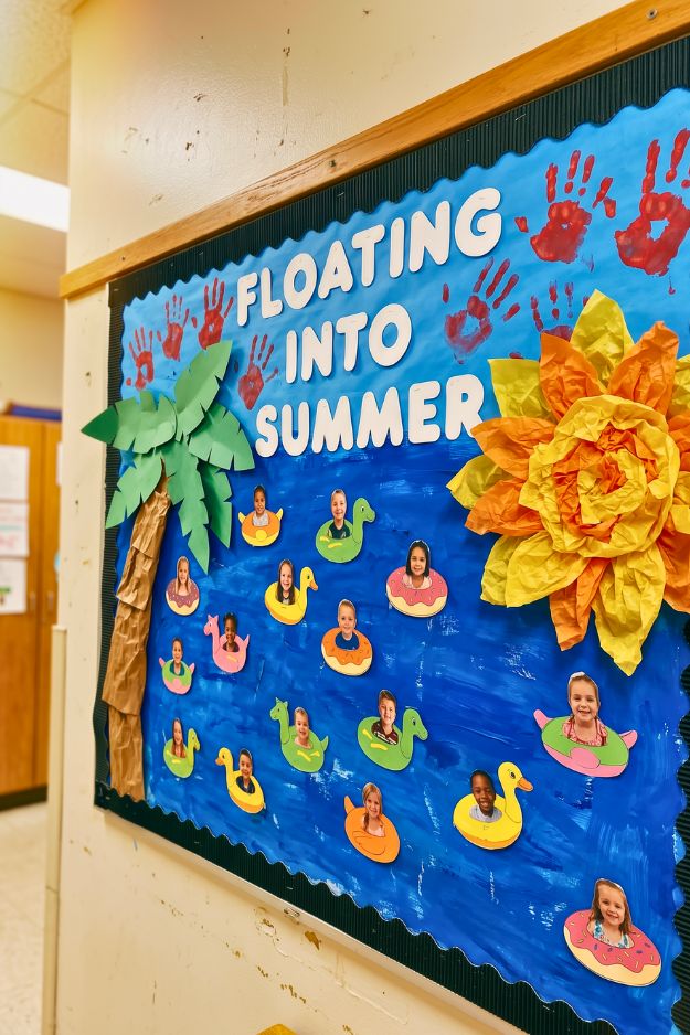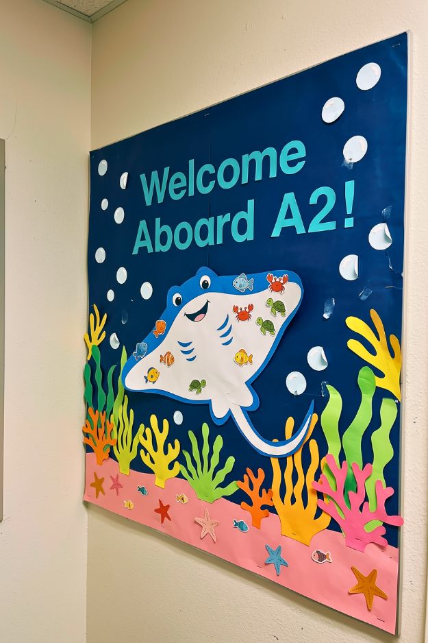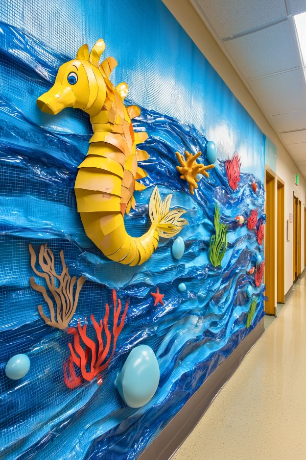 I’m genuinely obsessed with the way that layered yellow paper adds a serious sculptural quality to the seahorse. Overlapping the scales makes the whole character feel like a bespoke gallery piece rather than a school project. The real genius here is that crinkled translucent material used for the waves. Incorporating iridescent film adds a glassy, wet look that you just can’t get with flat construction paper. I’d steal the idea of using half-inflated blue balloons for bubbles to create instant texture. This is such a smart, budget-friendly way to fill a massive hallway wall.