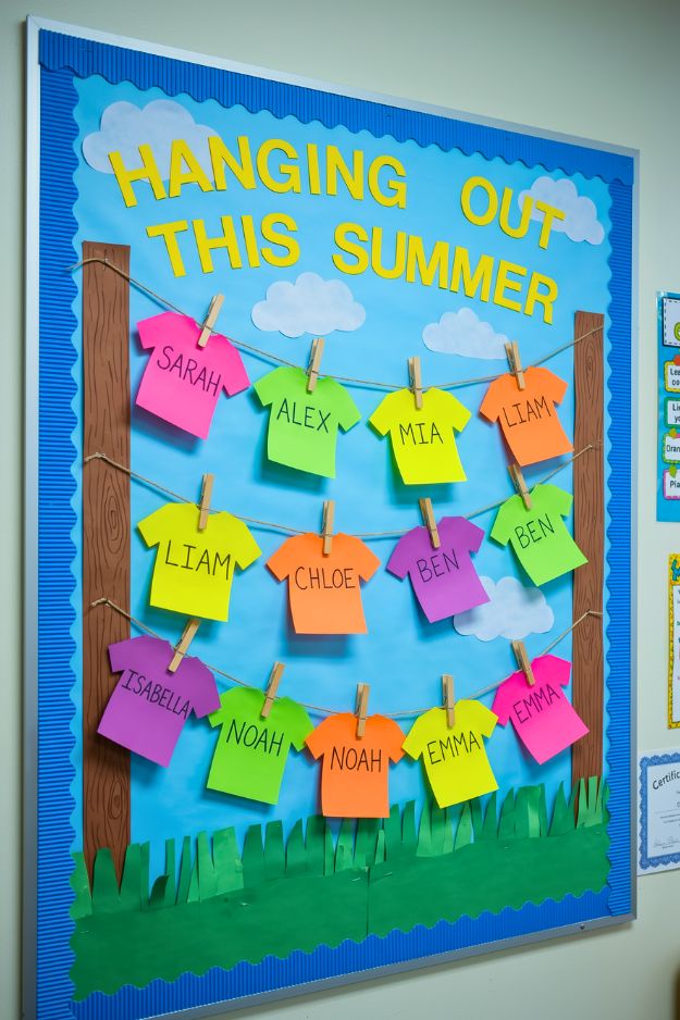 I love how the t-shirt cutouts make the student names feel like a design element rather than just a list. I’d steal the idea of drawing those wood-grain swirls on the posts with a simple brown marker to ground the whole scene.