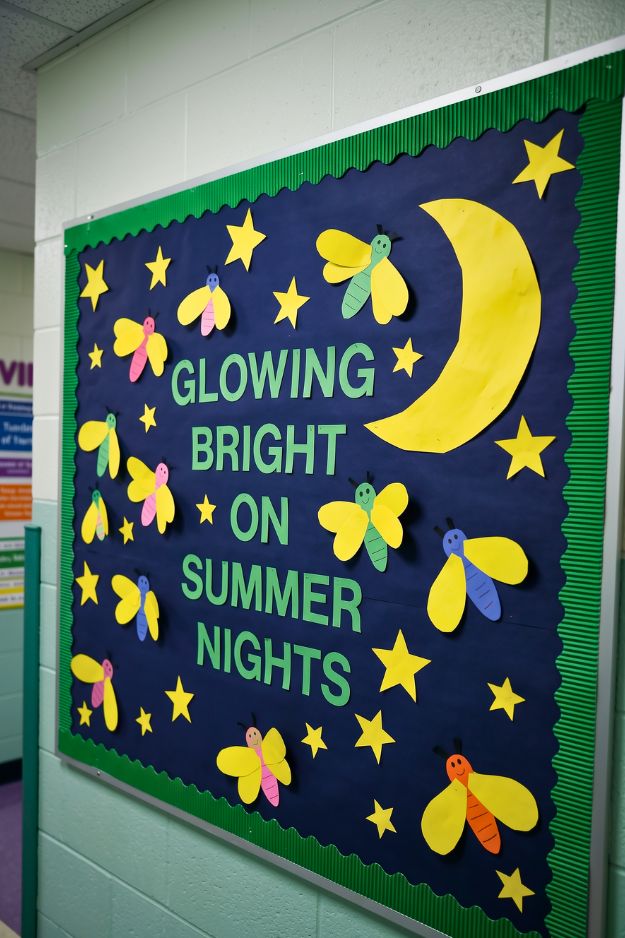This layout is a masterclass in using negative space to create a mood. That oversized crescent moon grounds everything while those little fireflies lead your eye right across the text. I’m honestly obsessed with the textured green border because it adds just enough weight to frame the night sky perfectly. If I were setting this up, I’d use 3D foam tape to pop the wings out from the board. Creating that tiny bit of shadow makes the paper insects feel like they’re actually fluttering off the wall.