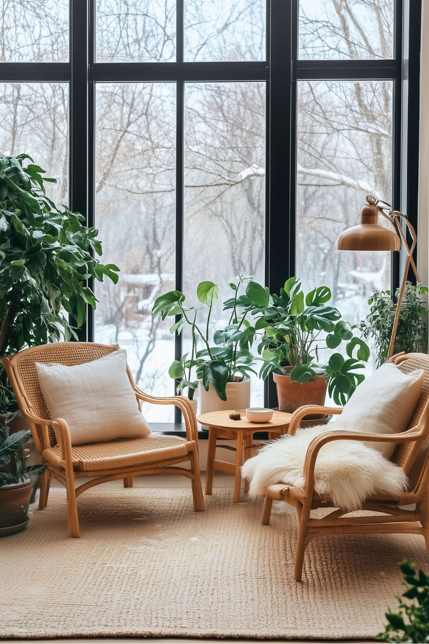 Having a corner like this is just like having a winter therapy in plant form. I’m totally inspired by the mix of rattan chairs, soft cushions, and that fluffy throw makes the whole setup feel warm without trying too hard for this holiday.