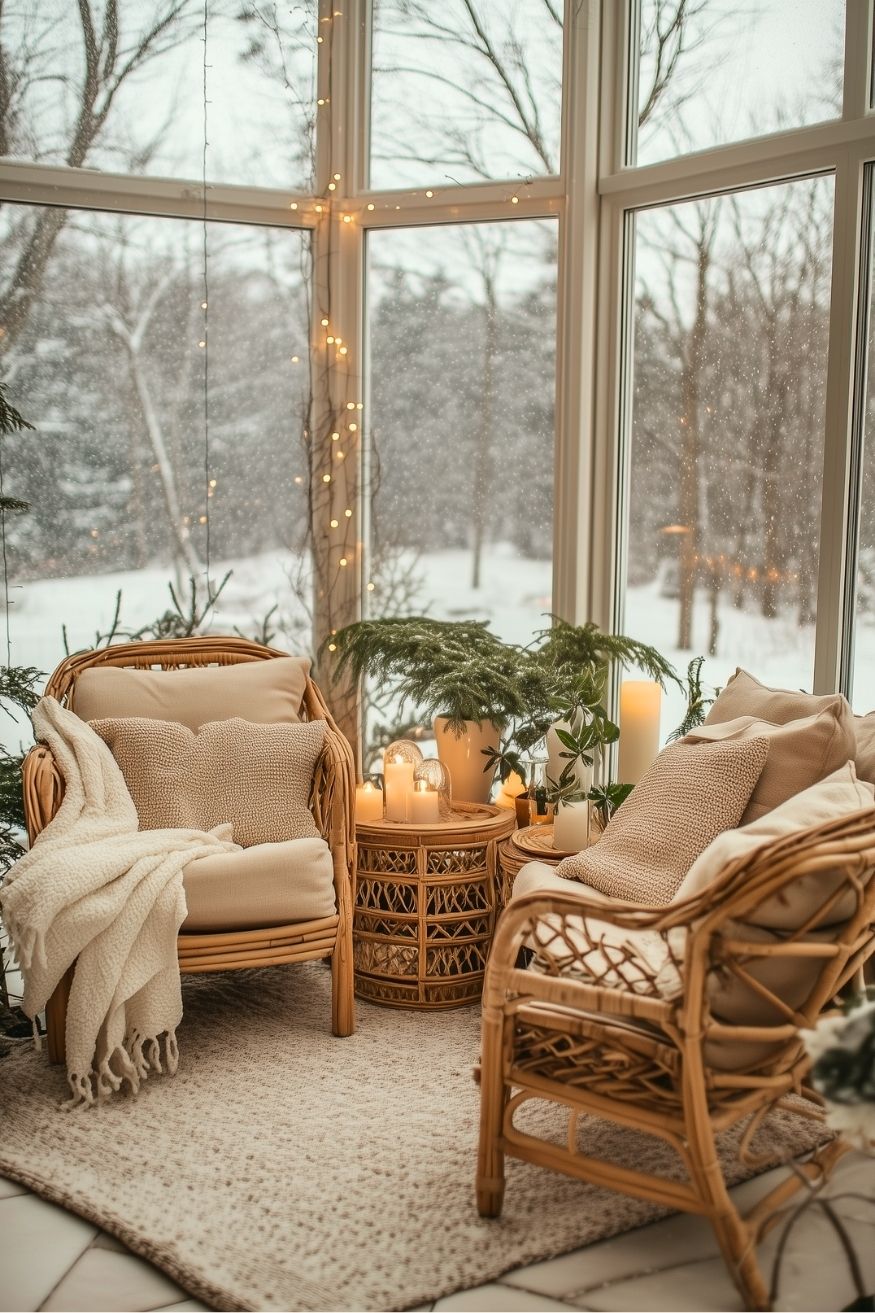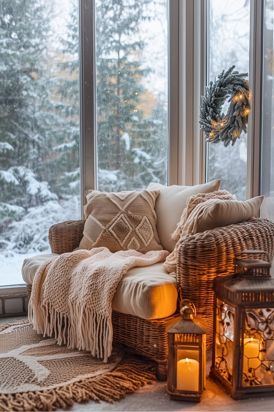 The wicker lounger piled with chunky knits and textured pillows almost feels like it’s pulling me in this freezing season. And the glow from those lantern candles warms the whole scene before you even sit down.