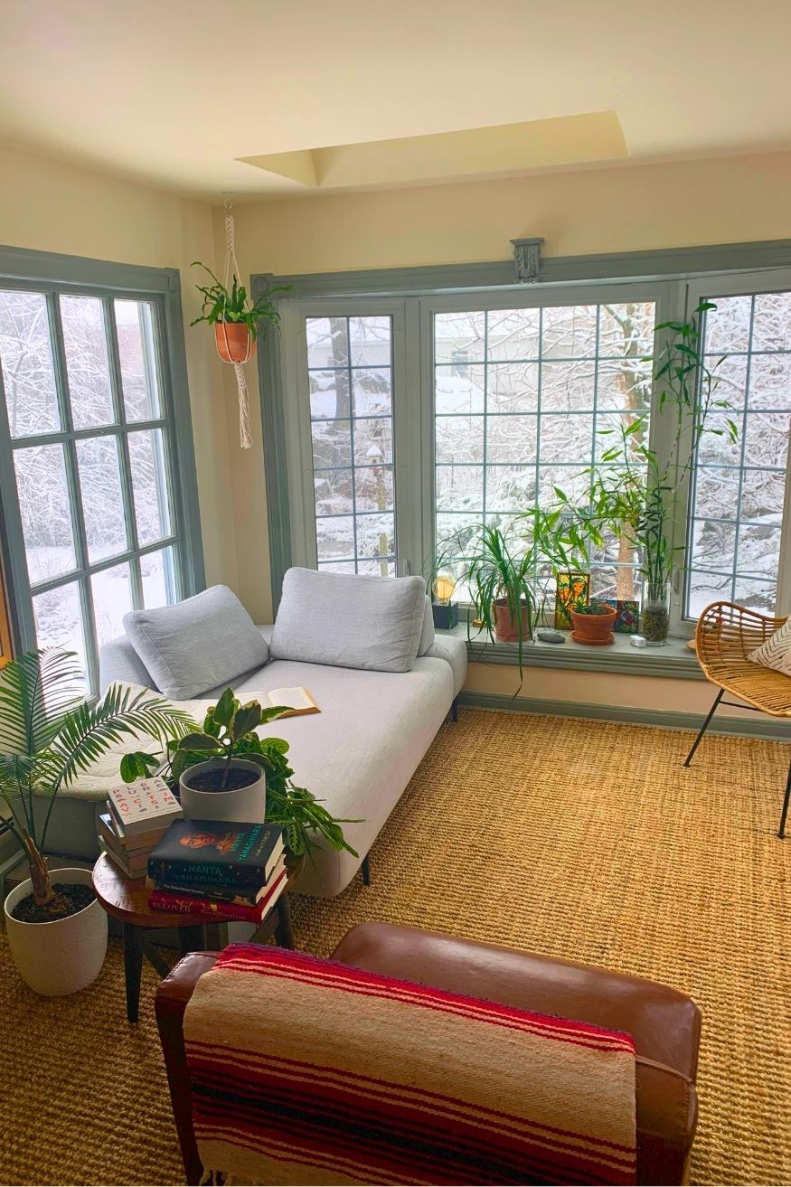 For me, this sunroom reading spot has that rare mix of calm and warmth that makes you want to drop everything and curl up for an afternoon in winter. I quite love how the shadows shift across the floor throughout the day, almost like the room is quietly performing while you’re watching the weather roll by.