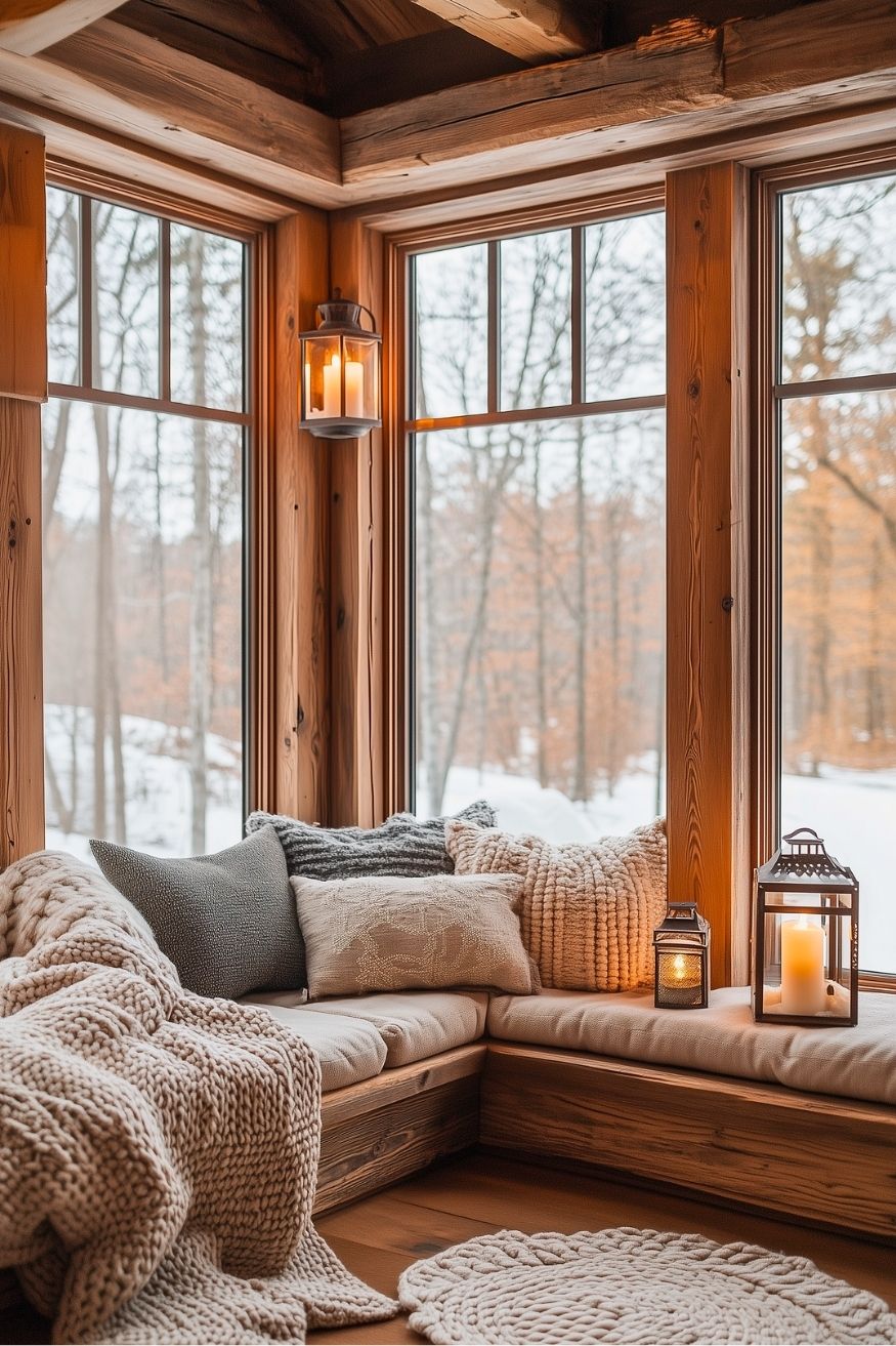 To be honest, I think this one might be one of the simplest ideas to recreate at home so far. You just need the chunky knits and soft pillows to make the space feel grounded and sheltered. The lanterns and wall sconce add just enough glow to warm up the snowy view outside, but do not steal the spotlight.