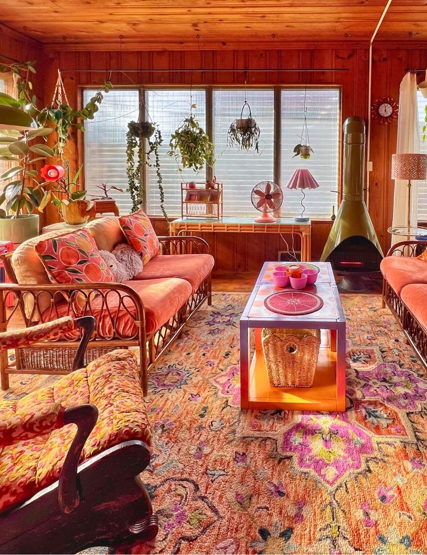 The color palette is bold in a way that shouldn’t work but absolutely does, with warm woods, saturated cushions, and those glowing grapefruit tones bouncing around like they’re charging the whole space. Altogether, that’s why the room feels so inviting in the cold months.