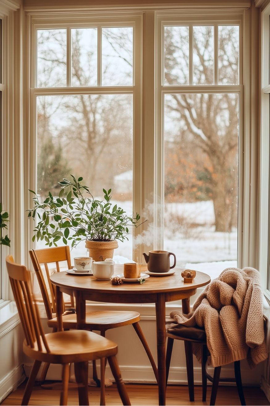 On these snowy days, a small round table tucked against the windows turns a simple tea break in your sunroom into something special. The mismatched chairs make it feel lived-in. The whole setup together works so well because it doesn’t feel like fighting winter.