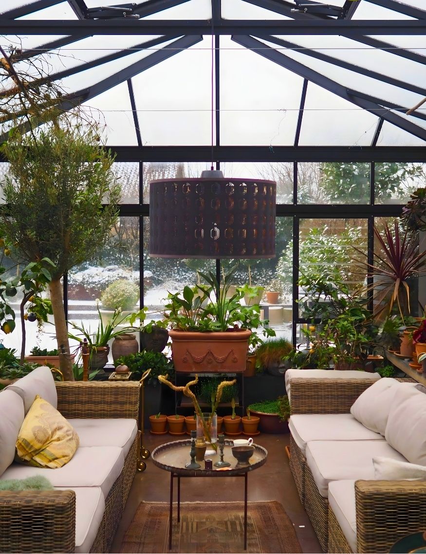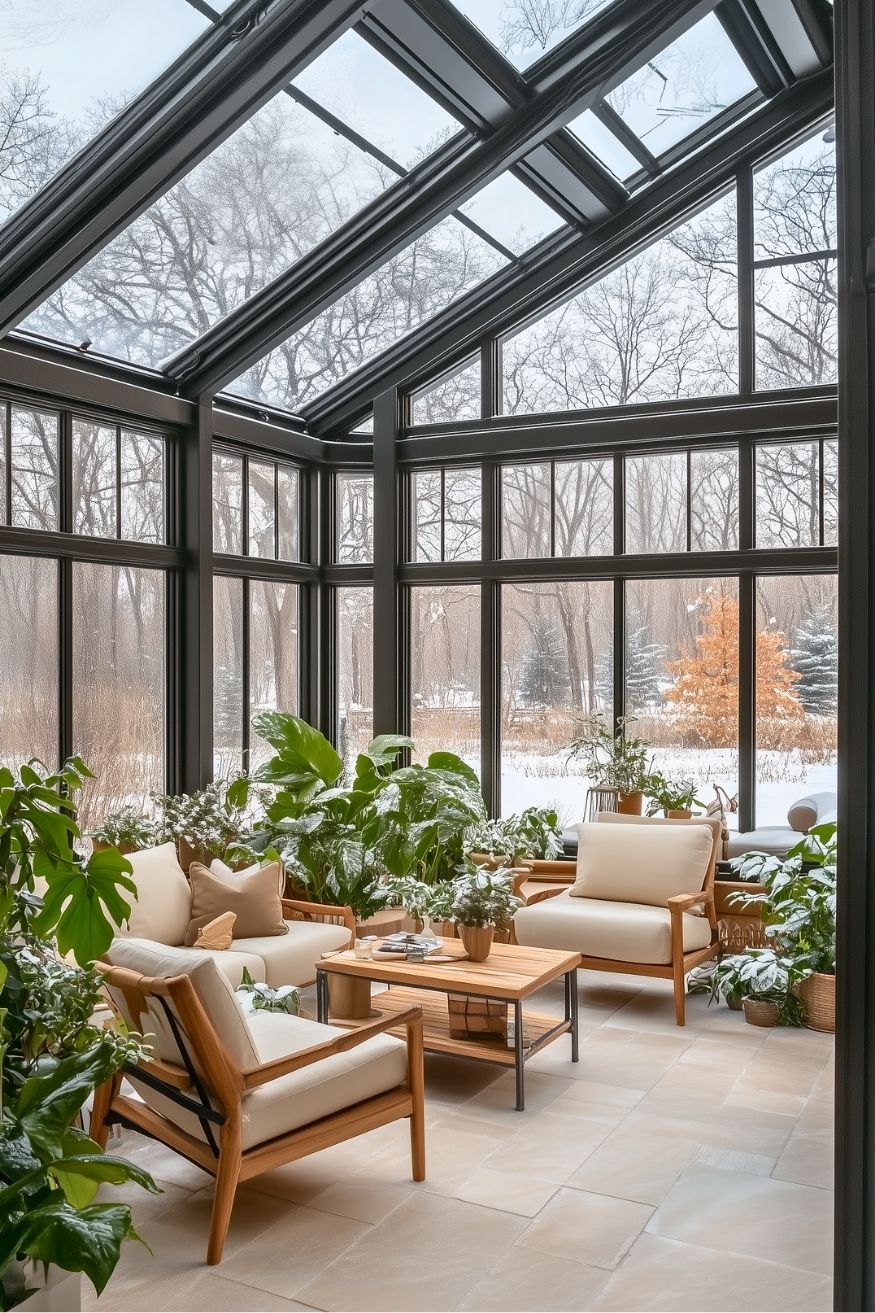 I think this one nails that golden-hour winter feeling. The glass ceiling of the solarium and wraparound windows pull in every bit of soft evening light. The space feels relaxed but still styled, like it’s ready for both quiet reading and long conversations.