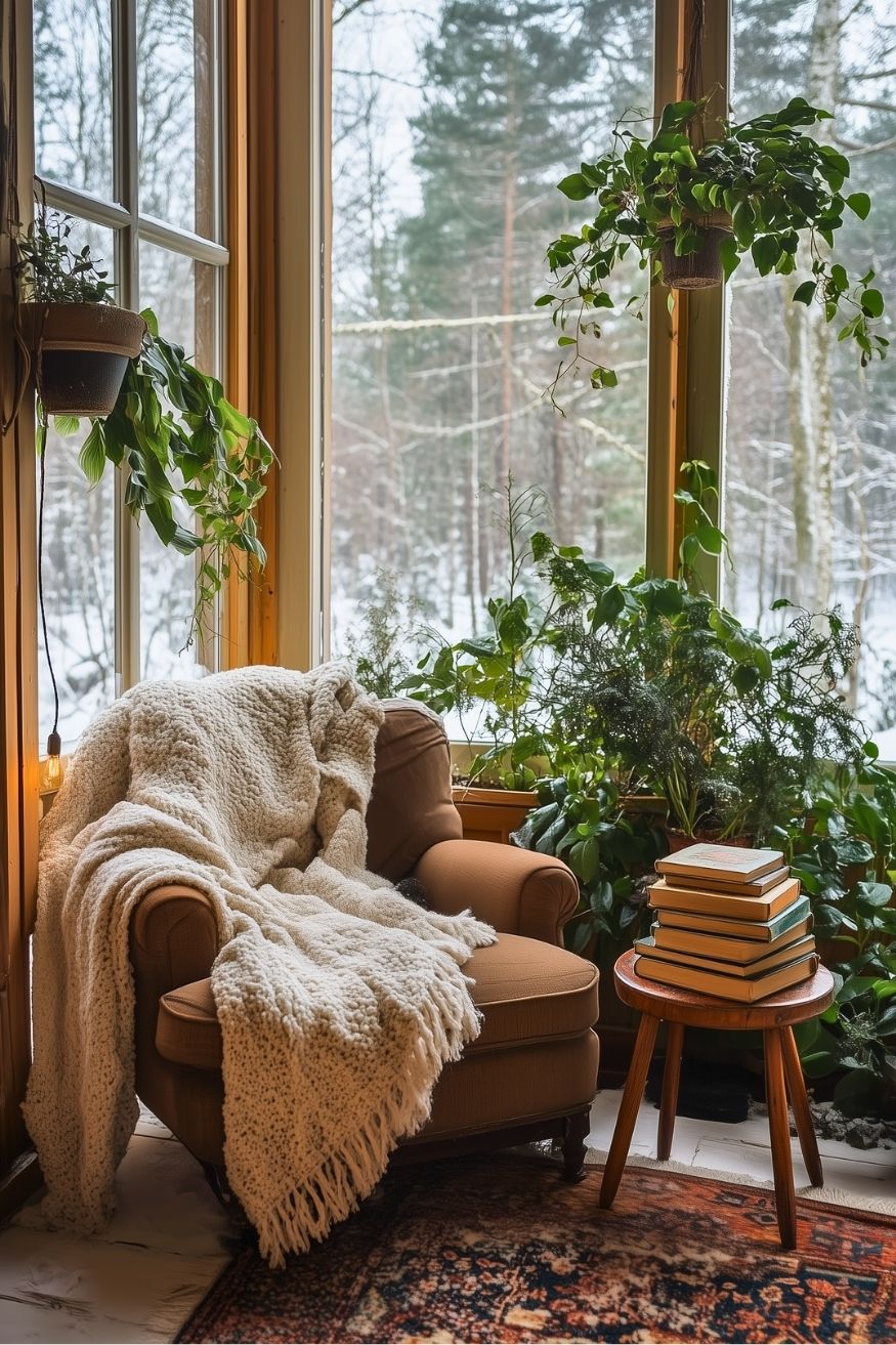 My jaw dropped when I first saw this one. It feels like winter’s version of a warm hug. The armchair is already inviting on its own, but that oversized knit throw turns it into a spot you could claim for hours. And the stack of books on that small wooden table is such a quiet promise that you’re allowed to stay here.
