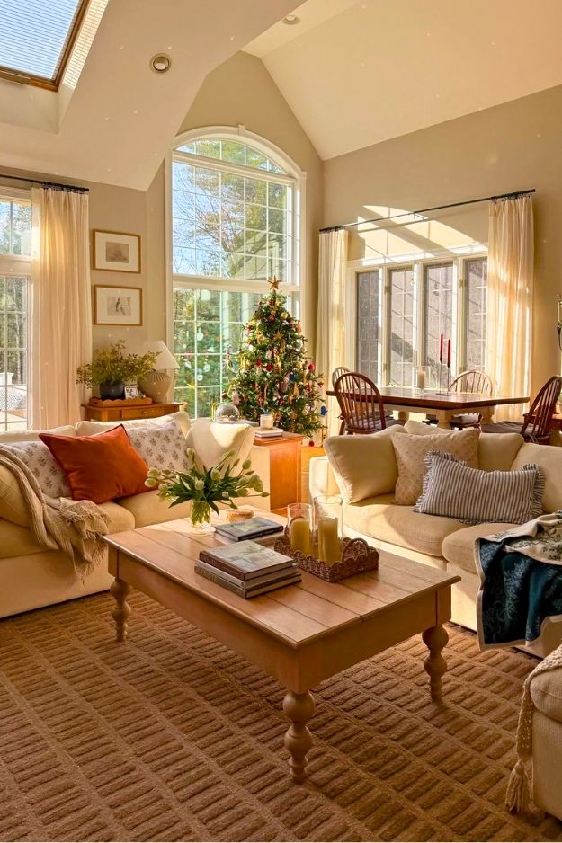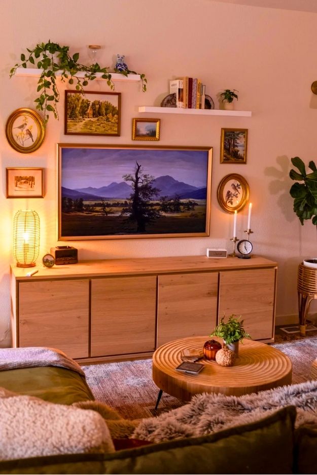 It’s funny how this PNW living room makes an Amazon coffee table look high-end. The warm wood tone and rounded shape give the space cozy vibes without trying too hard. I really like how Frame TV is disguised as art, the perfect lighting, and that calm, uncluttered vibe.