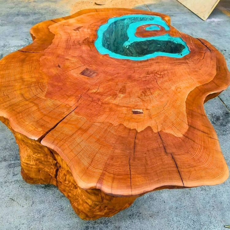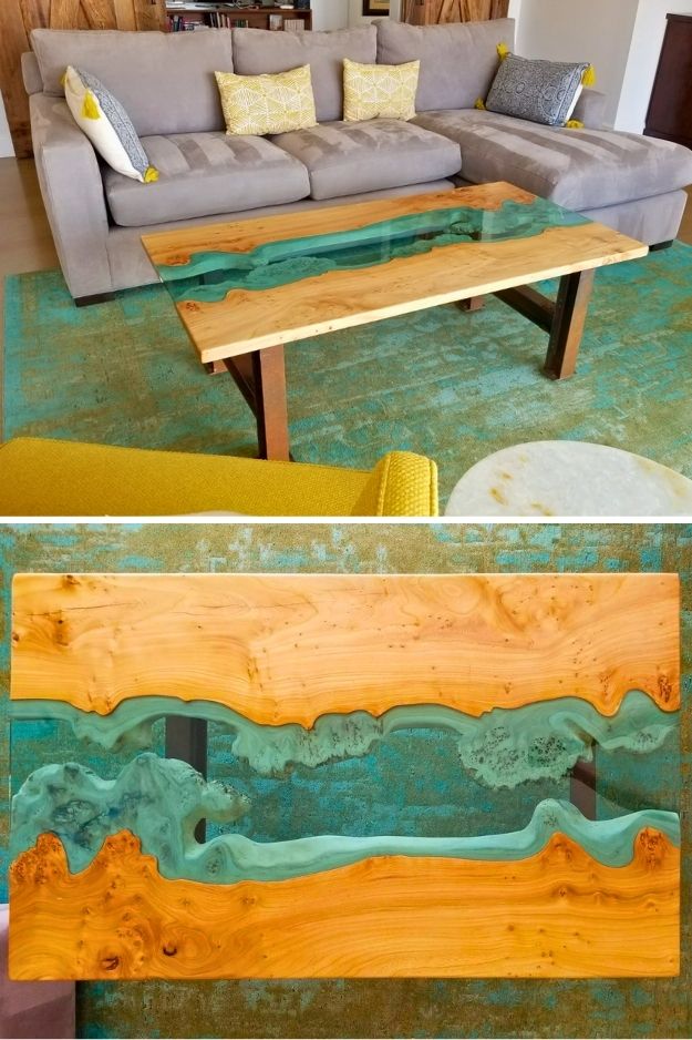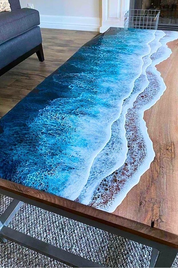 The “ocean surface” coffee table might be one of the few resin designs that still stops me in my tracks. It looks like a captured moment of surf frozen in glass, the swirling blues, foamy whites, and wood shore meeting so naturally it feels alive. Created by Rivka Wilkins and Woodworks by Jared.