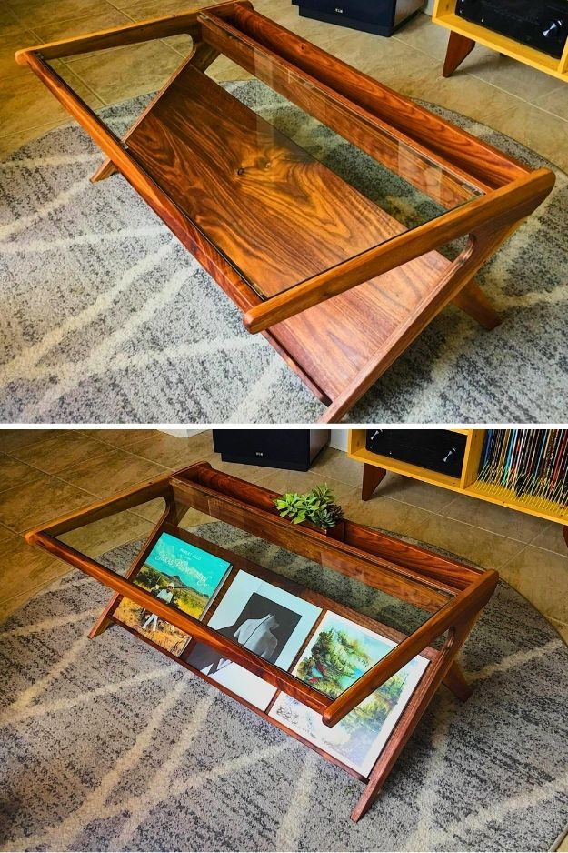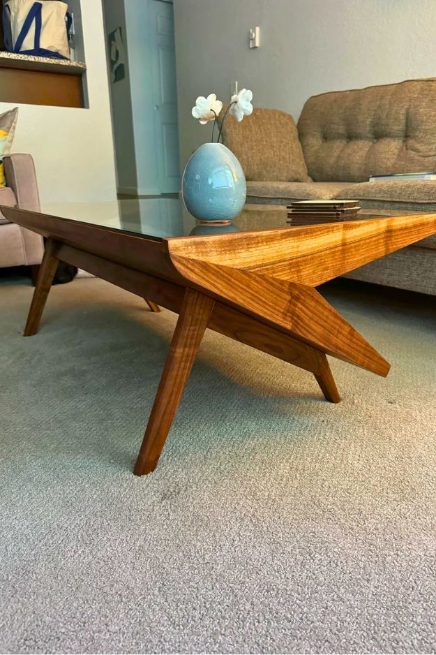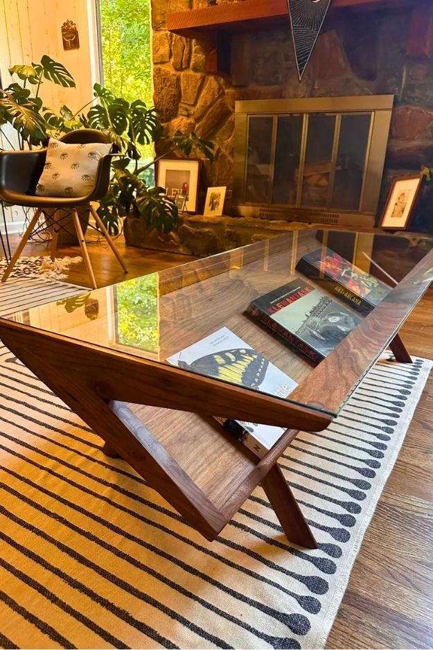 I love how this walnut coffee table nails that mid-century modern aesthetic. It’s wild that this was a DIY project, complete with repurposed glass from a $30 thrift find. It;s like a pro-level craftsmanship disguised as a home project.