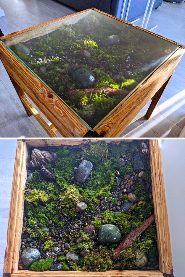 This table is such a clever mashup of two hobbies, woodworking and plant-keeping, and I kind of love it. Tim basically built a tiny self-sustaining forest under glass, complete with moss, condensation, and even springtails doing their thing. The fact that he used reclaimed wood and an old glass top makes it even better.