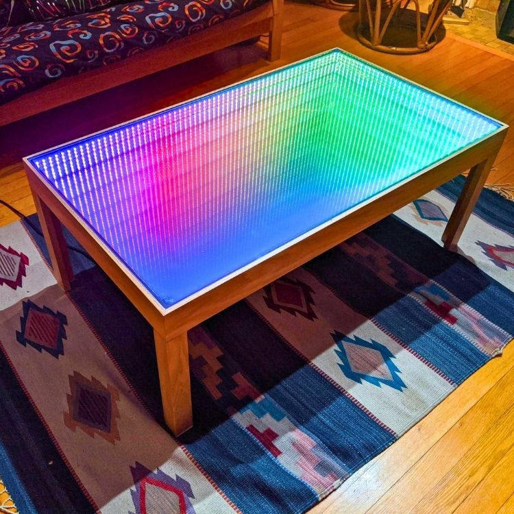 u/Procupine built what can only be described as a portal disguised as a coffee table, a 600-LED programmable infinity mirror masterpiece that looks like it could power an entire rave. He used WS2812B strips controlled by an Arduino Mega, sandwiched between a mirror base and a two-way mirrored top to create that endless, hypnotic glow.