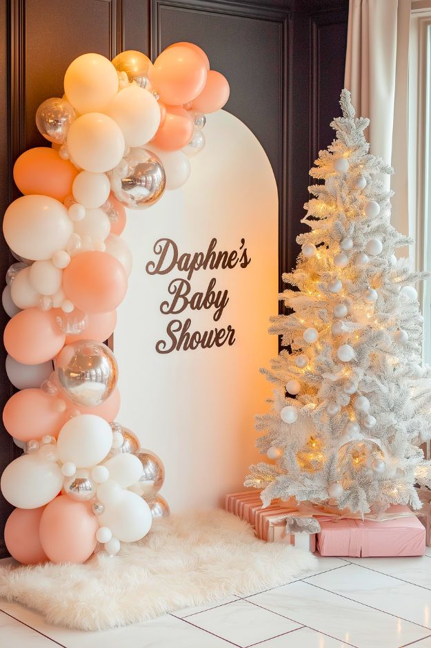 This setup honestly feels like one of the cutest indoor party backdrops I’ve seen. The silver, white, and blush balloons mixed with the soft lighting make everything feel warm and cozy, like a perfect little corner for hugs, photos, and baby shower memories.