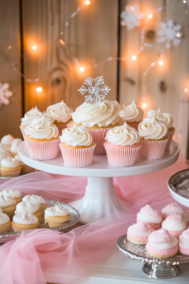 If you’re thinking about another dessert instead of cookies, cupcakes are honestly the easiest option to pull together, but once you add tiny snowflakes and soft twinkling lights around them, they turn into something really special. They’re the kind of treat you can just hold in your hand while walking around, chatting, and smiling without feeling messy or awkward.