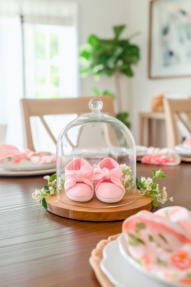 This little centerpiece is surprisingly easy to put together and double as a sweet keepsake for the mom-to-be. Just grab a pair of baby booties, tuck in a few soft floral details, and you’ve got a super simple setup that works as both adorable baby shower decor and a thoughtful gift.