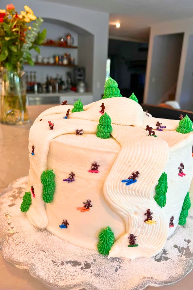 This skier sprinkle cake instantly gave me SkiFree flashbacks, in the best way. I love how the tracks, trees, and speckled “snow” turn it into a full mini ski slope instead of just decoration. The fact that it was a learning curve makes it even more fun, because it feels playful and homemade, not overly perfect.