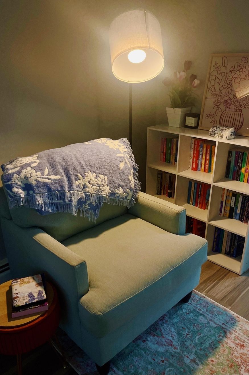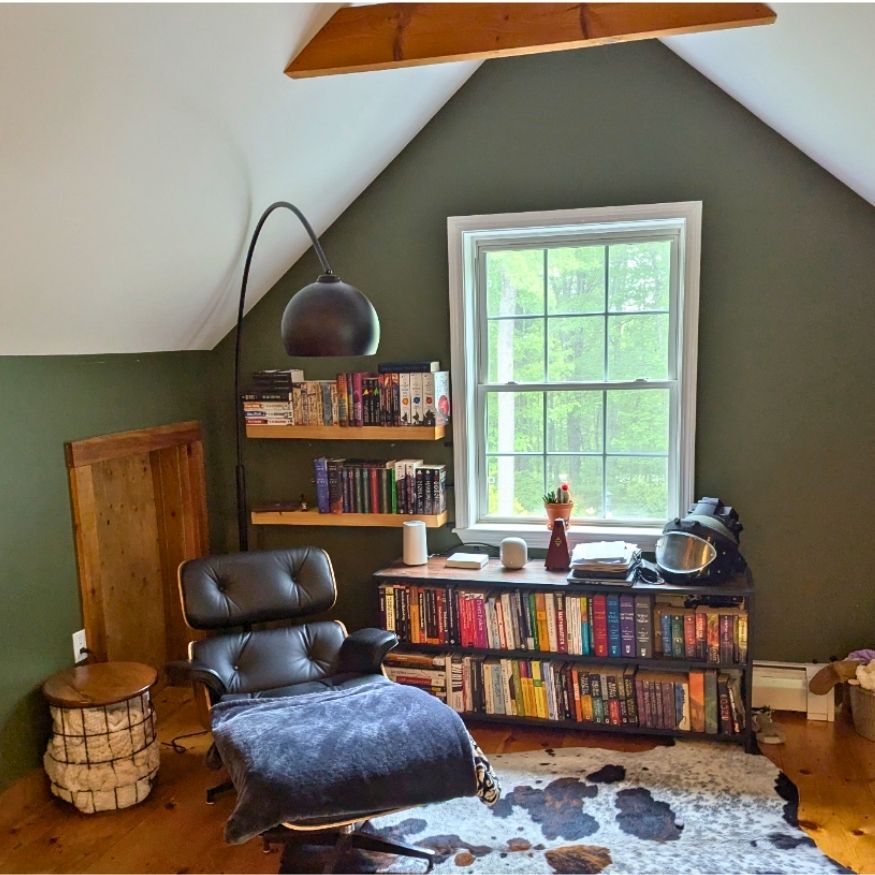 U/adept_platypus’s nook has such a cool mix of comfort and personality that I barely notice the slightly mysterious crawlspace doors in her background. The deep green walls make the wood trim and that Eames-style chair pop, and the whole setup feels like a spot you’d retreat to at the end of a long day with a book and a heavy exhale.