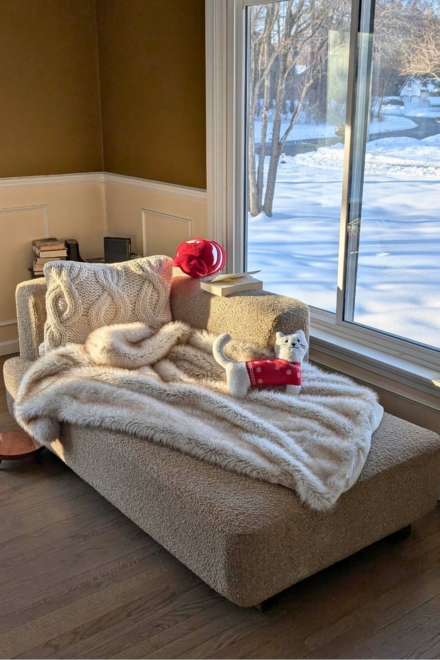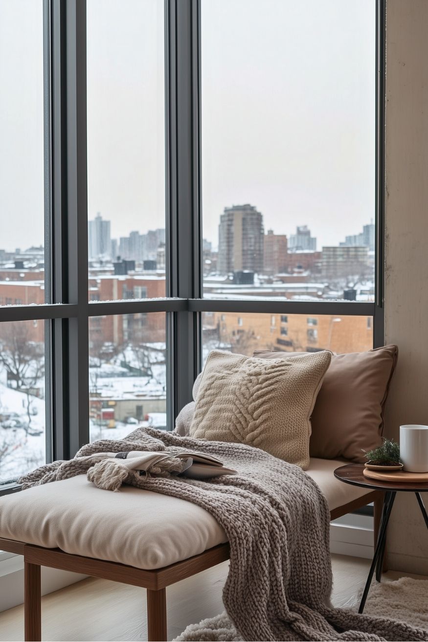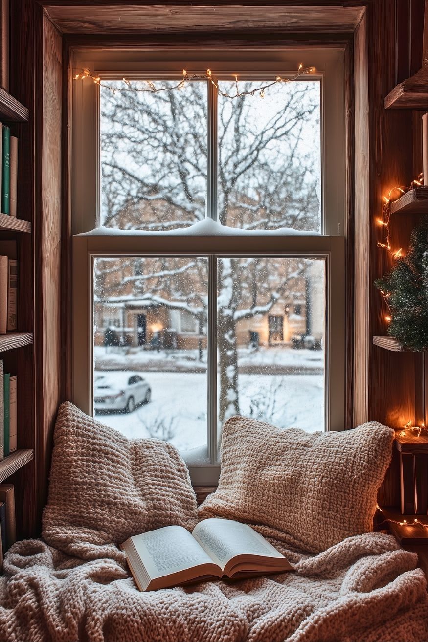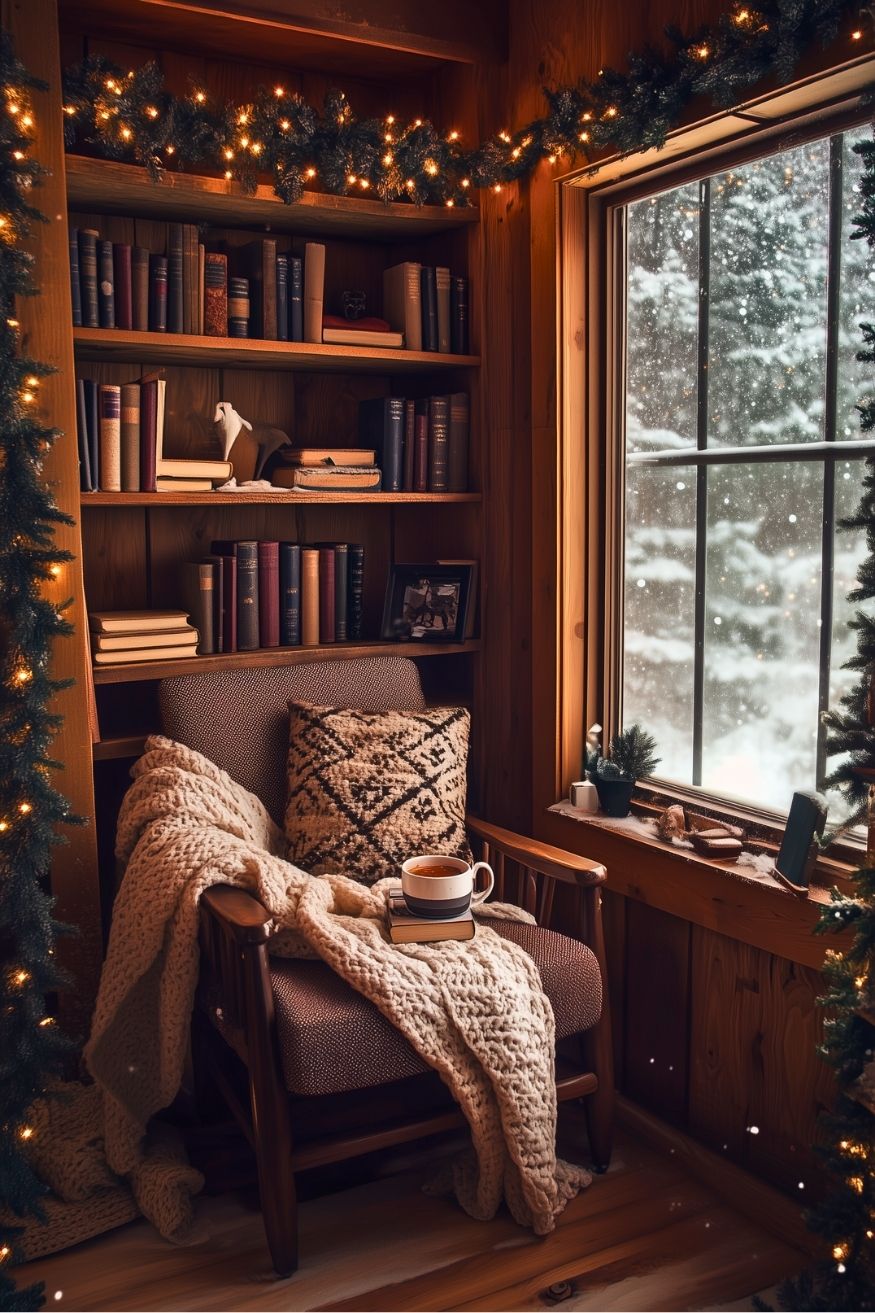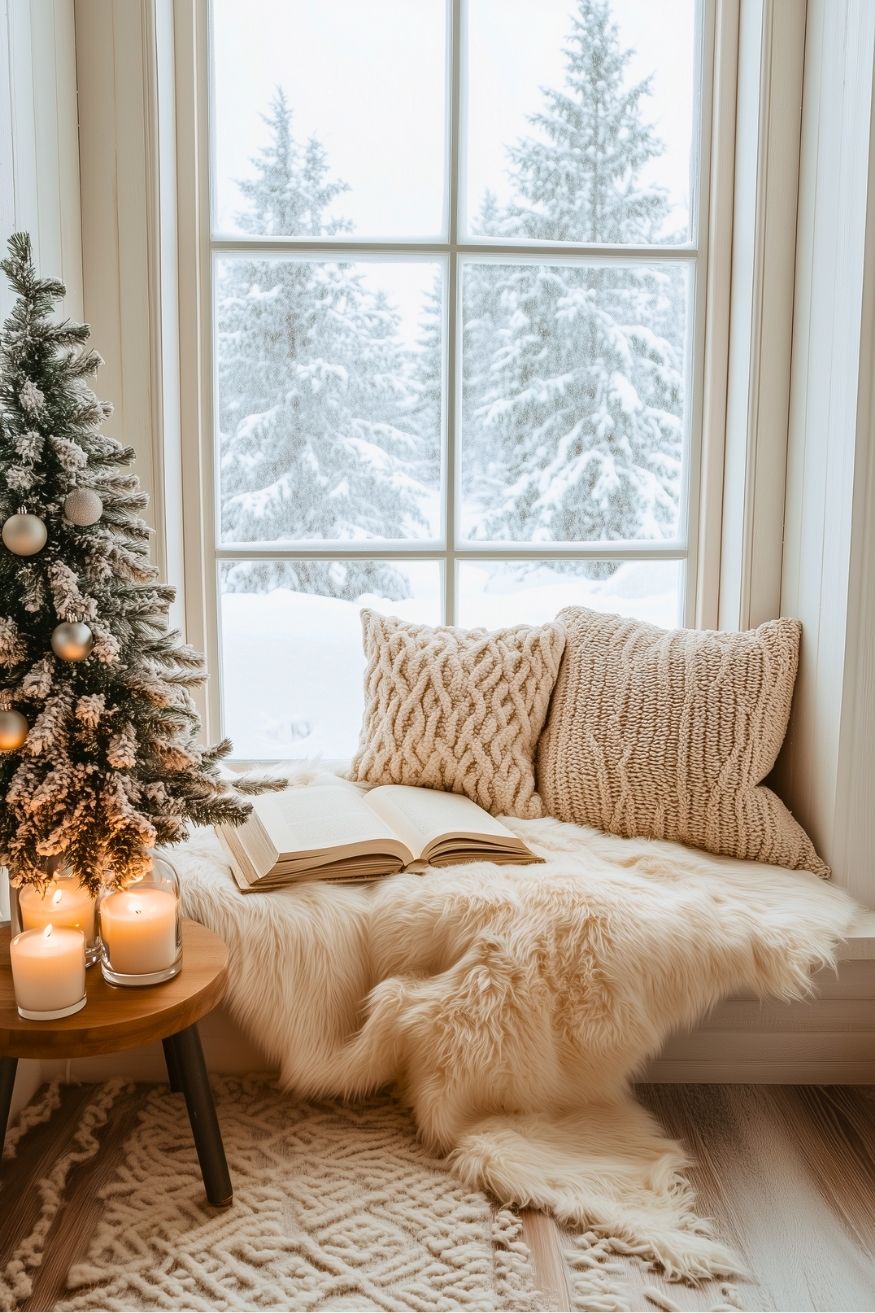 The soft neutral color schemes make the whole corner feel calm, while the frosted garland adds just enough winter charm without tipping into full Christmas mode. With the snow piling up outside, this nook turns into the kind of spot where you’d tuck your legs up, sip something warm, and let the world slow down for a minute.