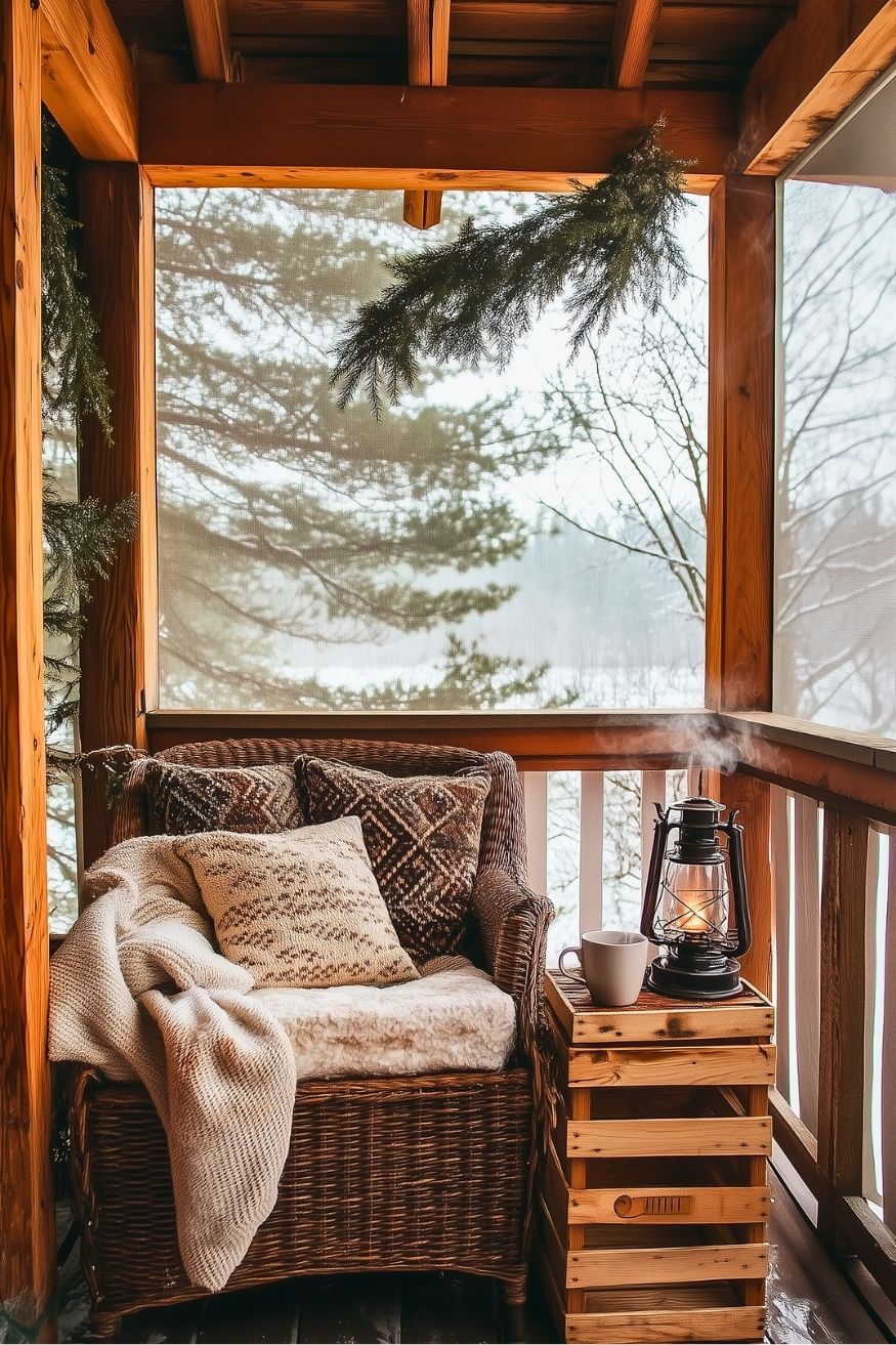 Even though this setup isn’t inside, I could still feel the coziness through the picture. The wicker chair stacked with textured pillows makes the whole space feel warmer than it has any right to be, and that soft throw practically begs you to sit for a minute. It’s the spot that turns a cold day into a quiet treat.