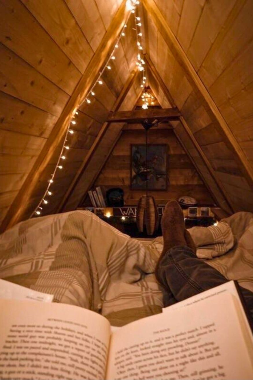 This nook should be the definition of cozy: wood walls, blankets, and twinkle lights. I actually want to spend a night here in winter night with my favorite book to hide from the world out there.
