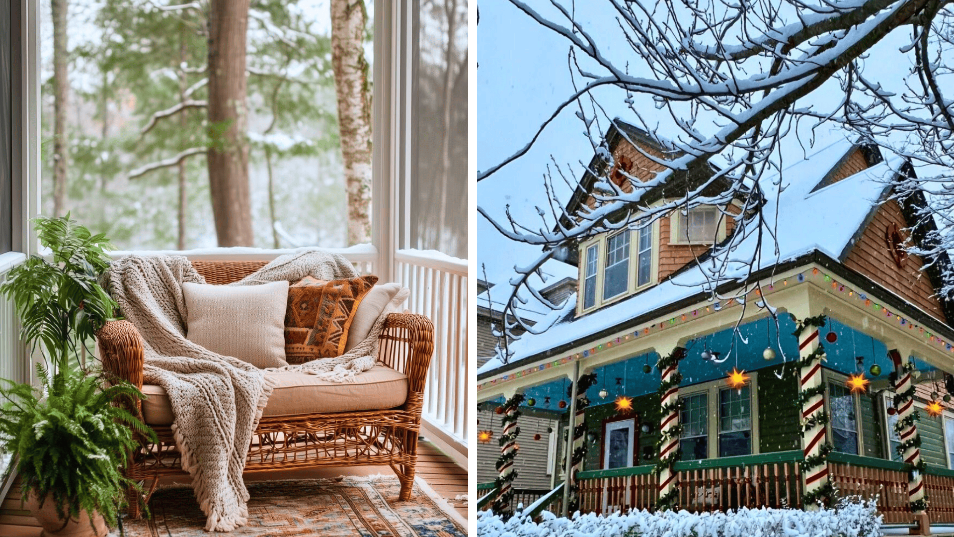 Even though this setup isn’t inside, I could still feel the coziness through the picture. The wicker chair stacked with textured pillows makes the whole space feel warmer than it has any right to be, and that soft throw practically begs you to sit for a minute. It’s the spot that turns a cold day into a quiet treat.