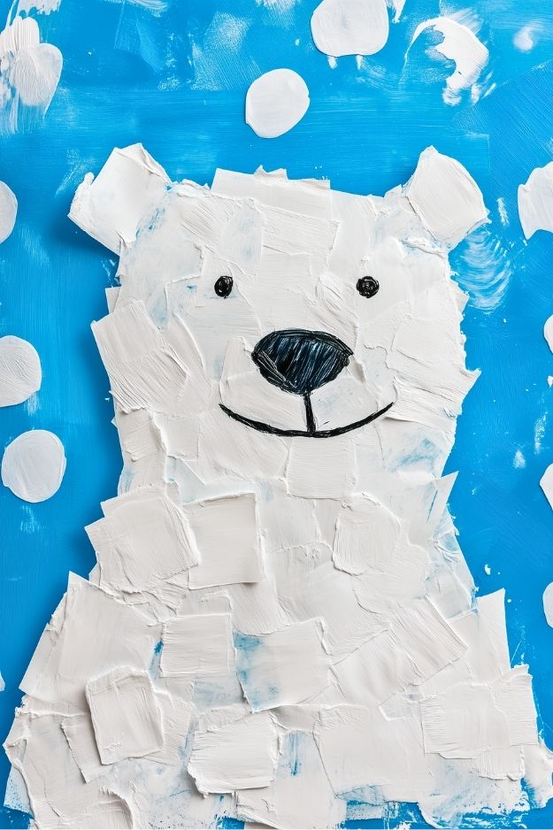 What I love about this polar bear is how wildly forgiving it is. Kids can smear, dab, and stack paint however they want, and it still turns into the sweetest winter face staring back at them. The chunky white patches almost feel like little snow blankets, and the messy brushstrokes in the background make the whole thing look playful instead of “perfect.”