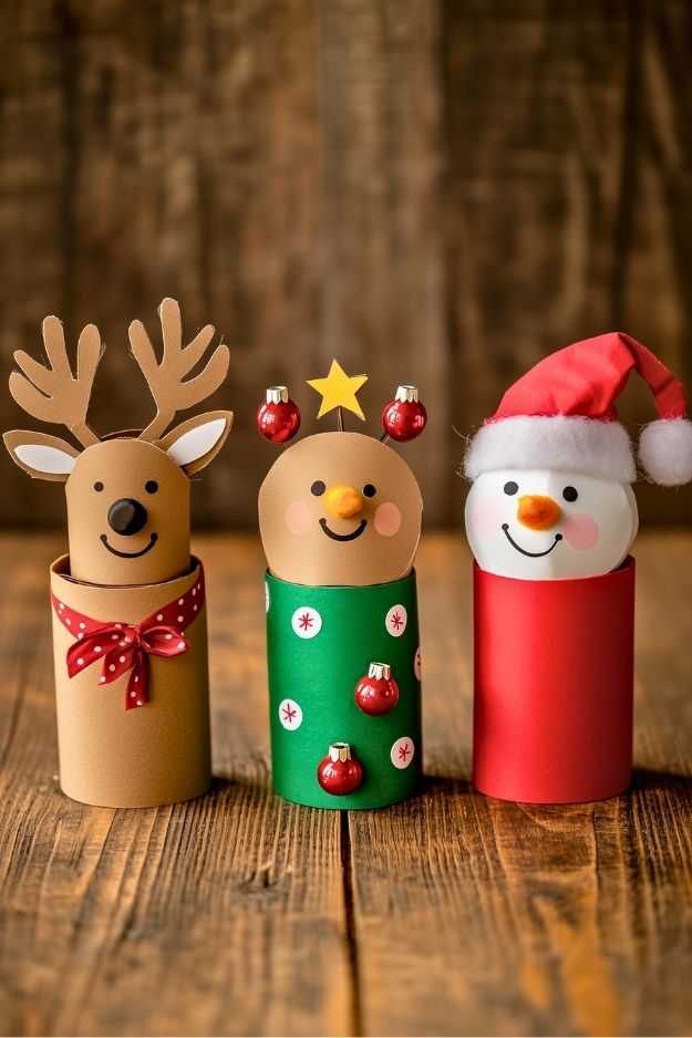 Kids light up when a craft lets them build little characters, and these paper roll buddies make that happen fast. They can turn one tube into a reindeer with big antlers, another into a Christmas tree sprinkled with ornaments, and a third into a snowman wearing the cutest floppy hat. Nothing about this project feels fussy, which is why it’s great for all ages.