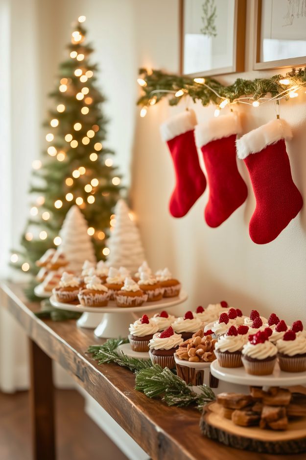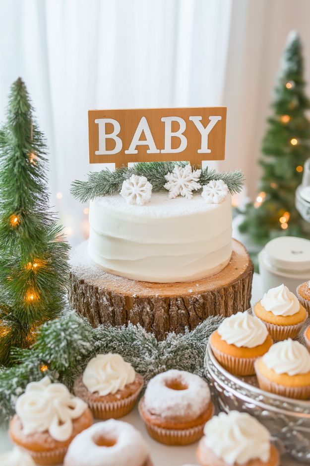 Nothing really compares to a winter baby shower dessert table, and this one feels especially inviting. The stockings and soft lights give it that holiday warmth without trying too hard, and the little white trees look almost magical sitting behind the cupcakes.