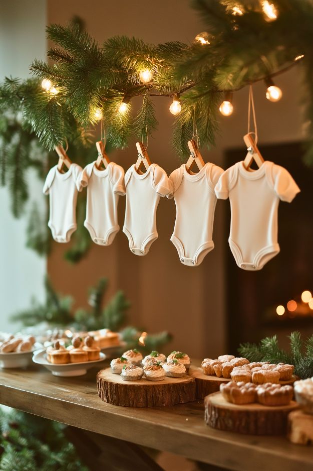 Oh this is such a lovely idea, hanging the little onesies like ornaments instantly makes the whole dessert table feel warmer and more personal. I kind of love how the soft white fabric pops against the pine branches and lights, almost like a tiny laundry line in the coziest cabin ever. It’s simple, sweet, and honestly such an easy way to add that “baby shower” charm.