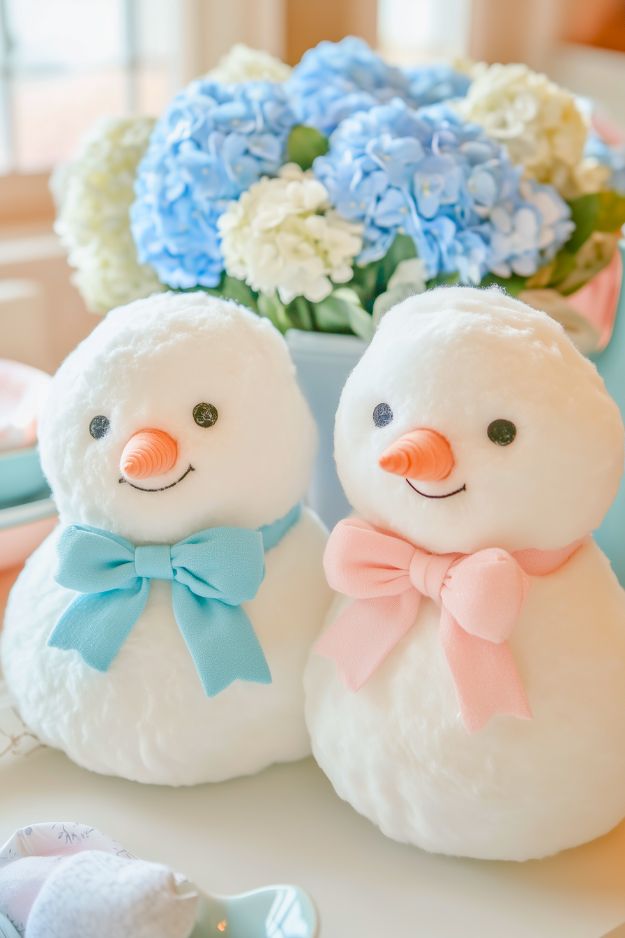 These little snowmen are almost too cute for words, and they instantly make the whole table feel softer and sweeter. The blue and pink bows keep it perfectly on-theme for a winter baby shower without trying too hard.