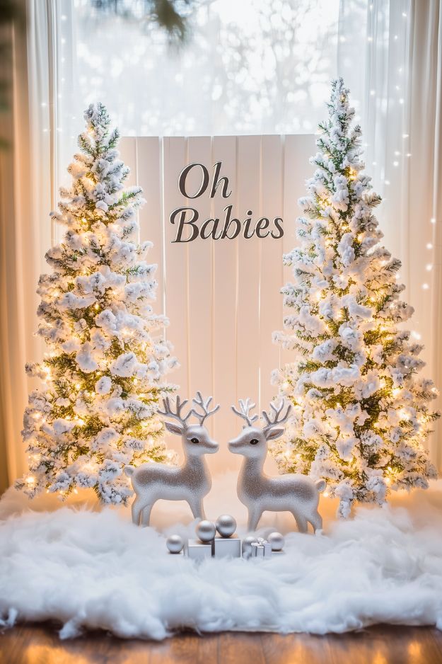 It’s such a cute idea to set up a snowy little scene like this. The frosted trees and baby reindeer make the whole corner feel soft and welcoming, almost like a tiny winter nursery. I kind of love how simple it is, but it still looks magical enough for a baby shower backdrop.