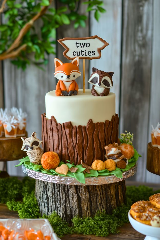 I kind of adore how this woodland cake leans into the cozy forest vibe without feeling overdone. The little fox and raccoon toppers are ridiculously charming, and the tree-bark detailing around the bottom layer makes the whole thing look like it grew right out of the mossy stand.