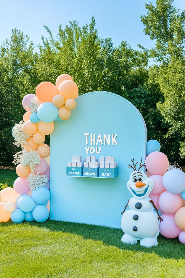 The soft pastel balloons feel like a snowy daydream, and the giant Olaf is doing exactly what Olaf does best: bringing that goofy, warm energy to a baby shower. The simple thank-you shelf keeps it clean and organized, and the whole thing has that bright, happy look that makes a winter baby shower feel extra welcoming.