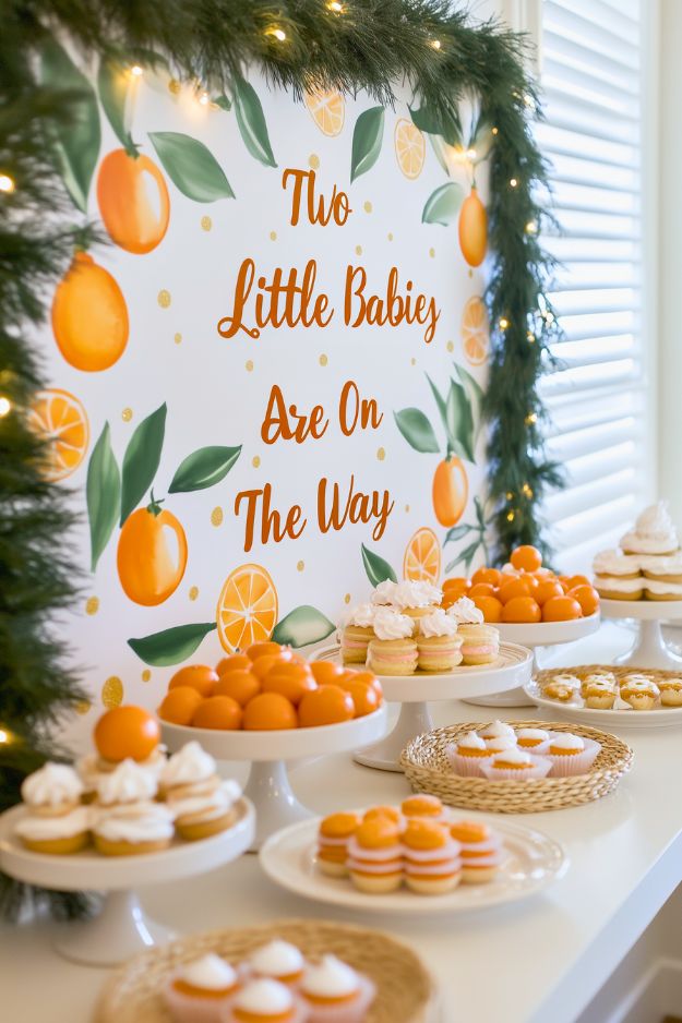 This citrus setup feels so fresh and cheerful, and honestly citrus is one of those themes I think you can sneak into any season. The bright oranges and little desserts make the whole table look lively without being loud. I love how the greenery frames the sign, almost like a soft winter garland warming up the space.