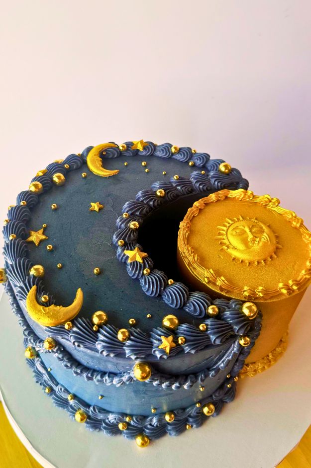 This sun-and-moon cake already feels magical, but what really gets me is how easily it could double as a gender-reveal moment. I can imagine cutting into that deep blue buttercream and finding a surprise color inside, all tucked into that crescent shape like a little secret. Credit to GetMeAJuiceBoxBiatch