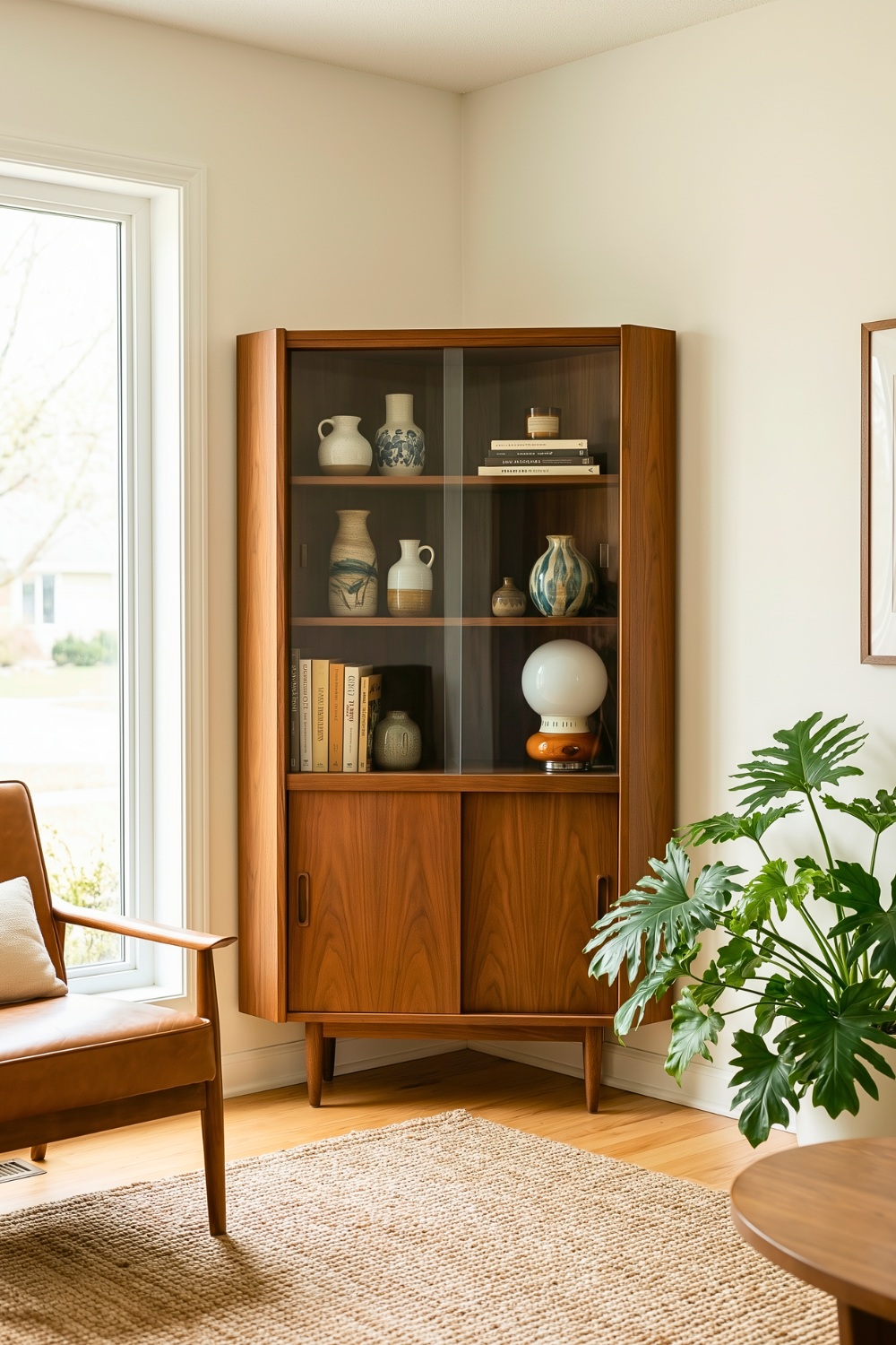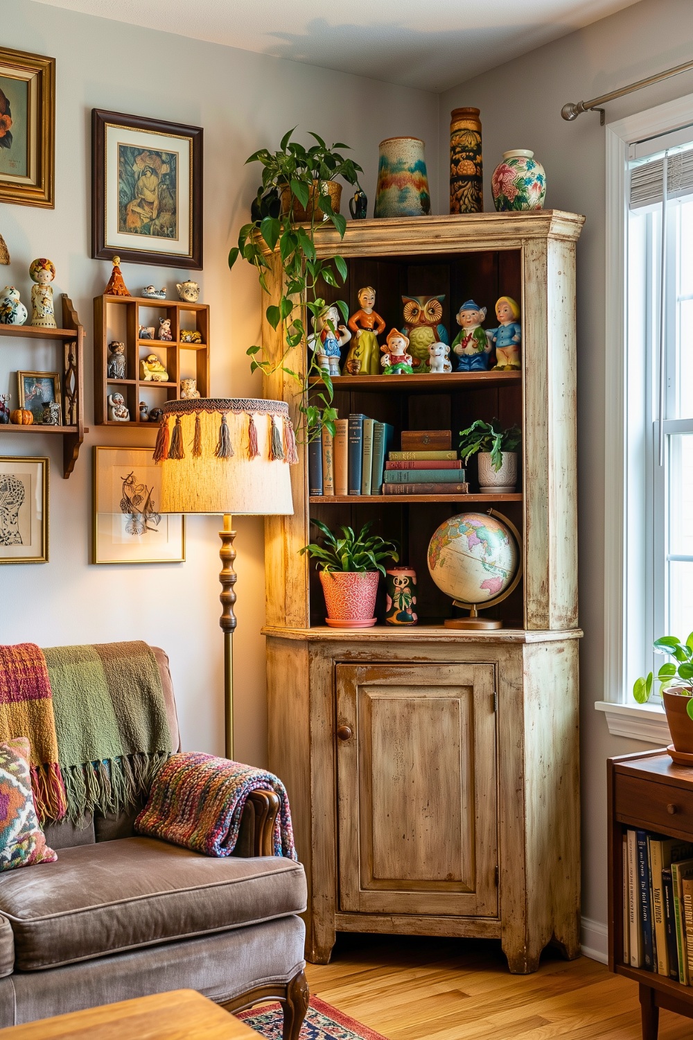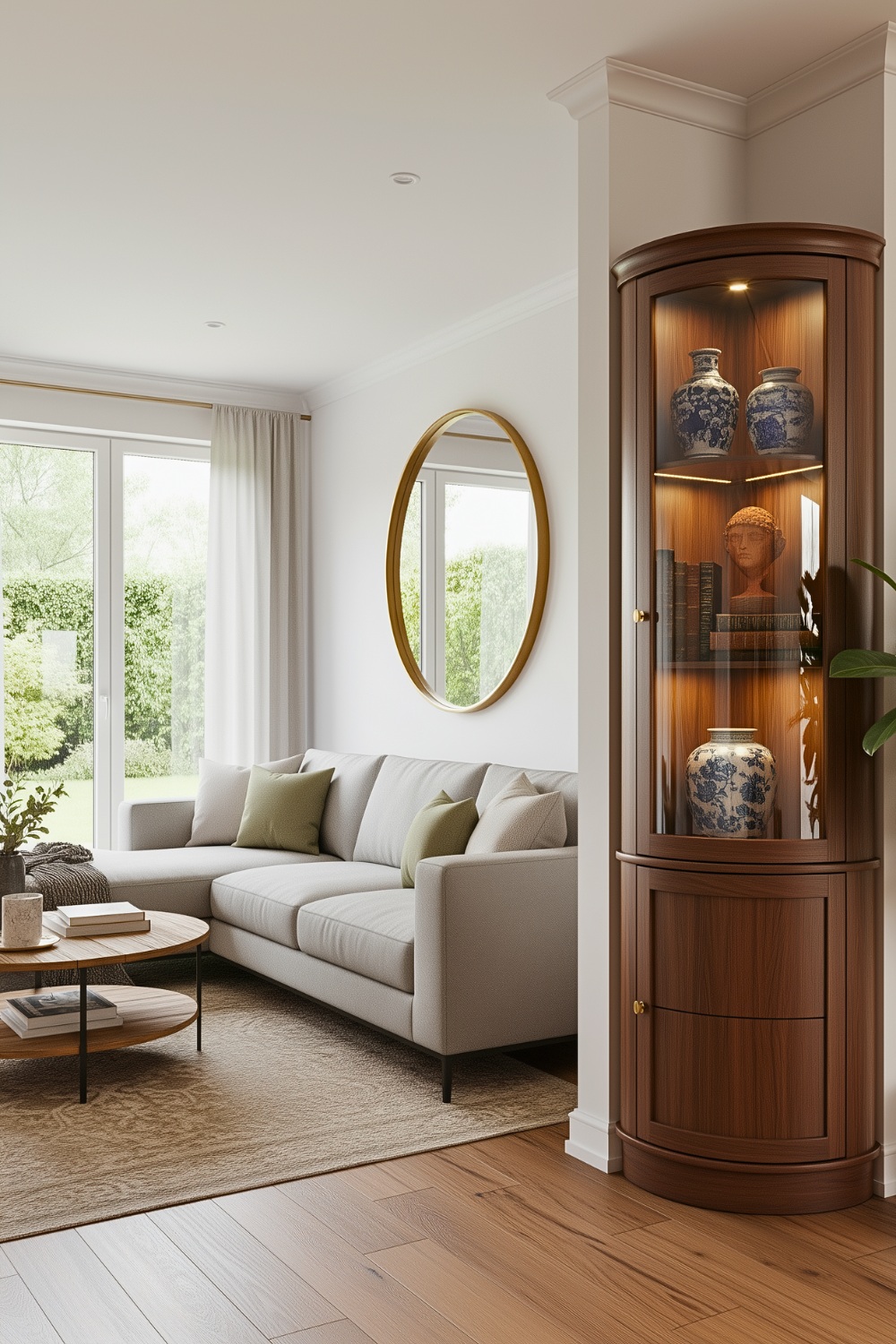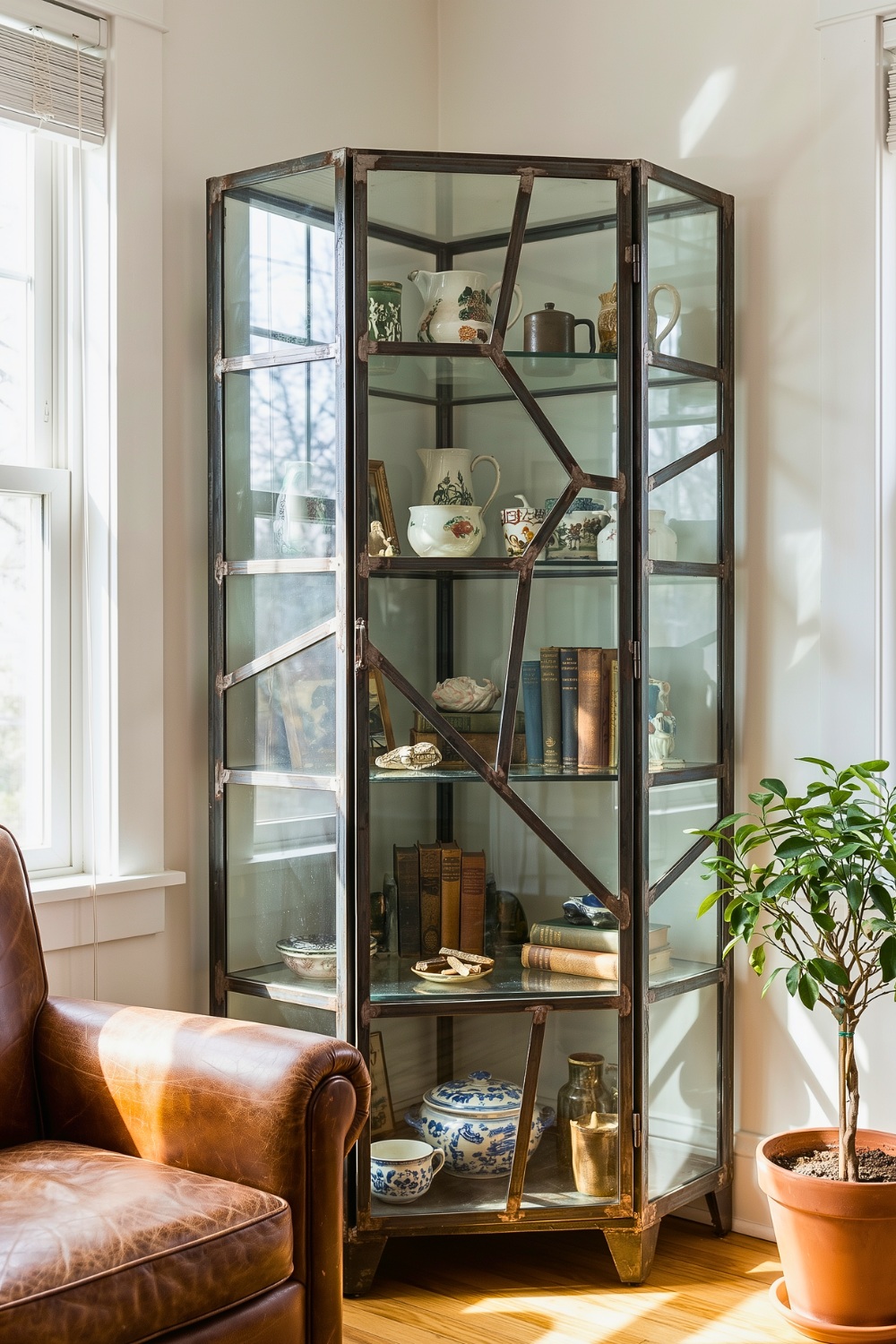 I’m convinced that a tall, curved curio is the best way to fill a nook without it feeling heavy. The glass panes let you see your antique collections while keeping them safe from dust. This display idea is perfect for a small floor plan because it uses vertical space so well.