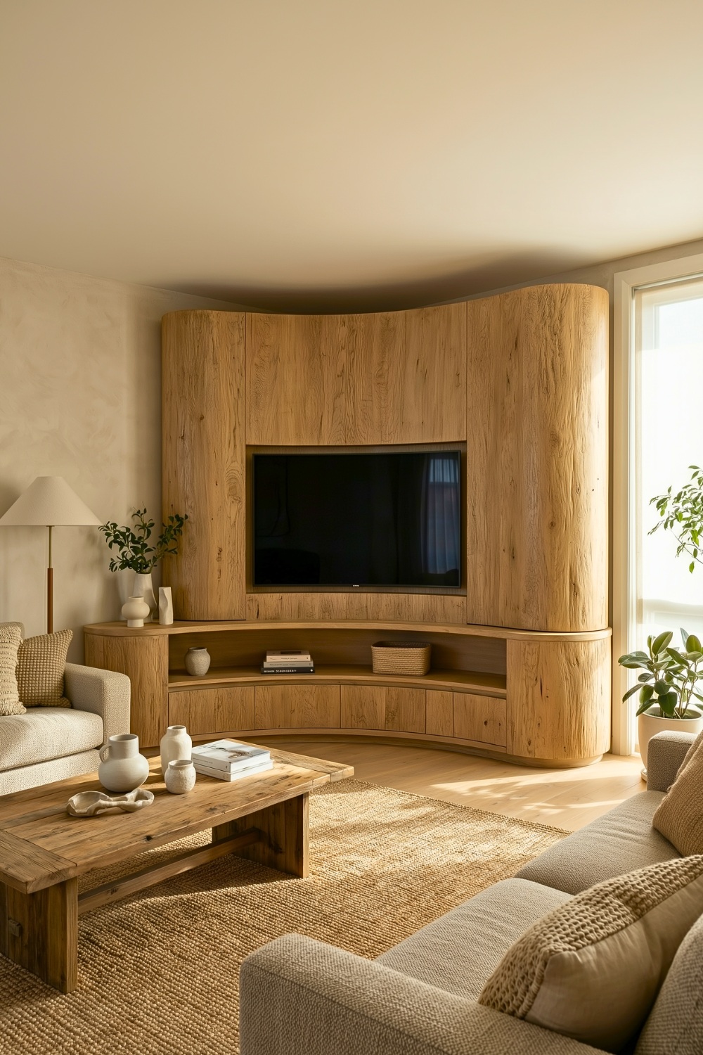 Big rooms can sometimes feel a bit “square,” so I love how curved lines can soften things up. This custom built-in works as a full entertainment center, making the TV look like it belongs there. The oak tones give it a warm, modern energy that really makes a statement.