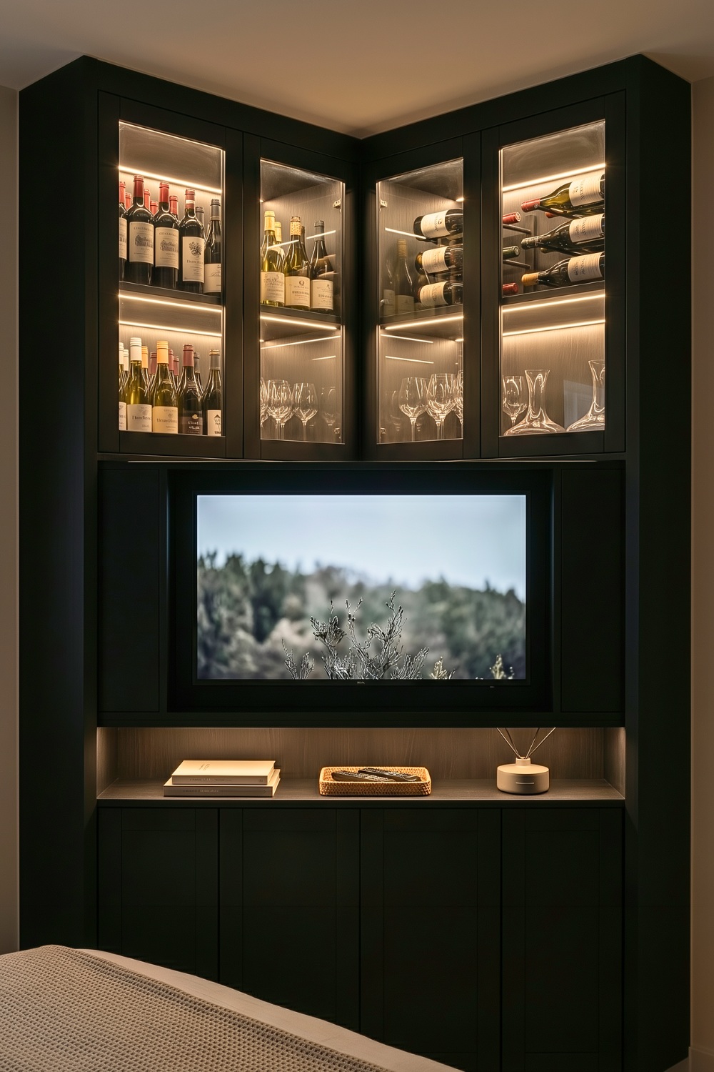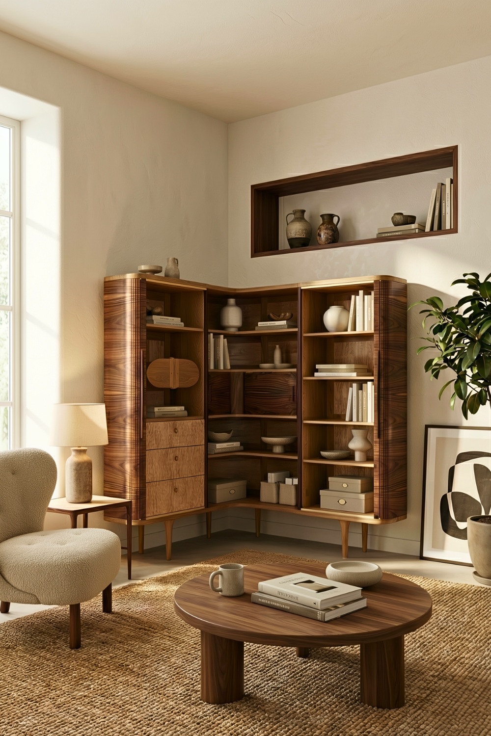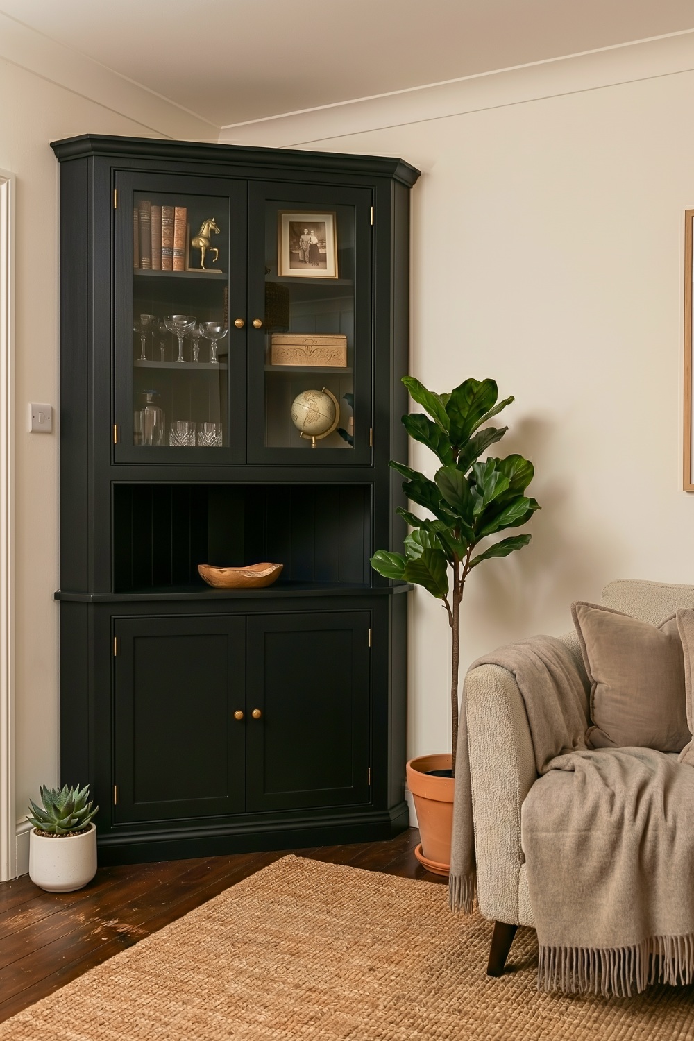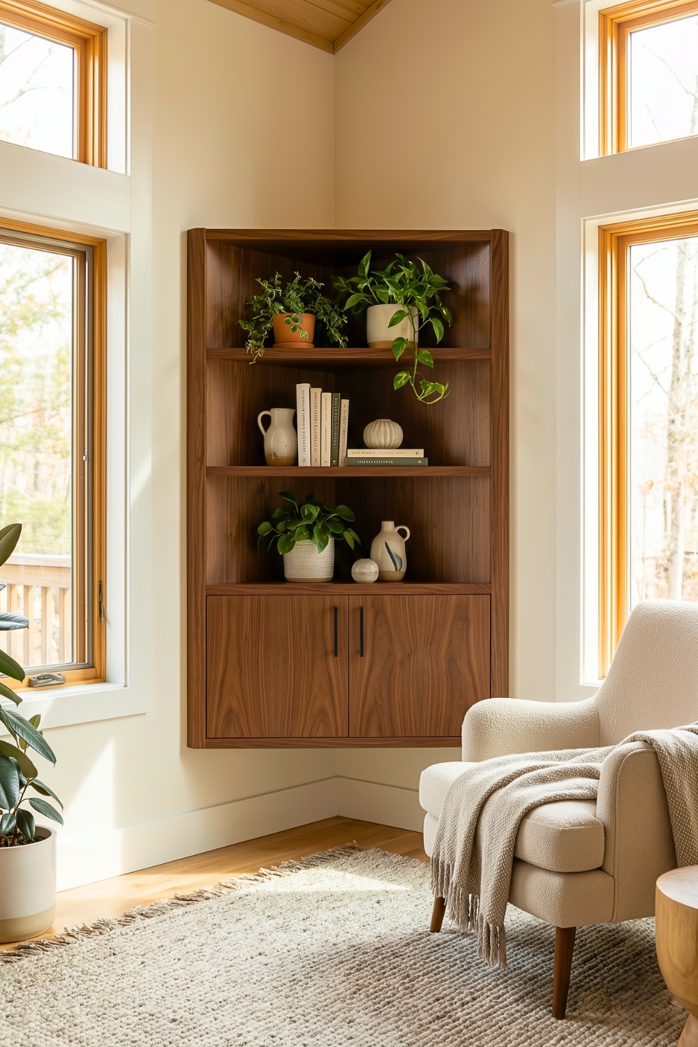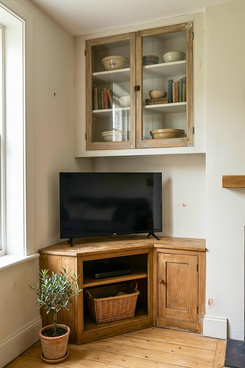 Every room needs some hidden storage, and I think adding doors to the bottom of a corner unit is a smart move. You can keep the upper cabinet open for books while hiding messy cords behind those built-in panels. It’s a great way to keep your decorating looking sharp while handling all the “real life” clutter.
