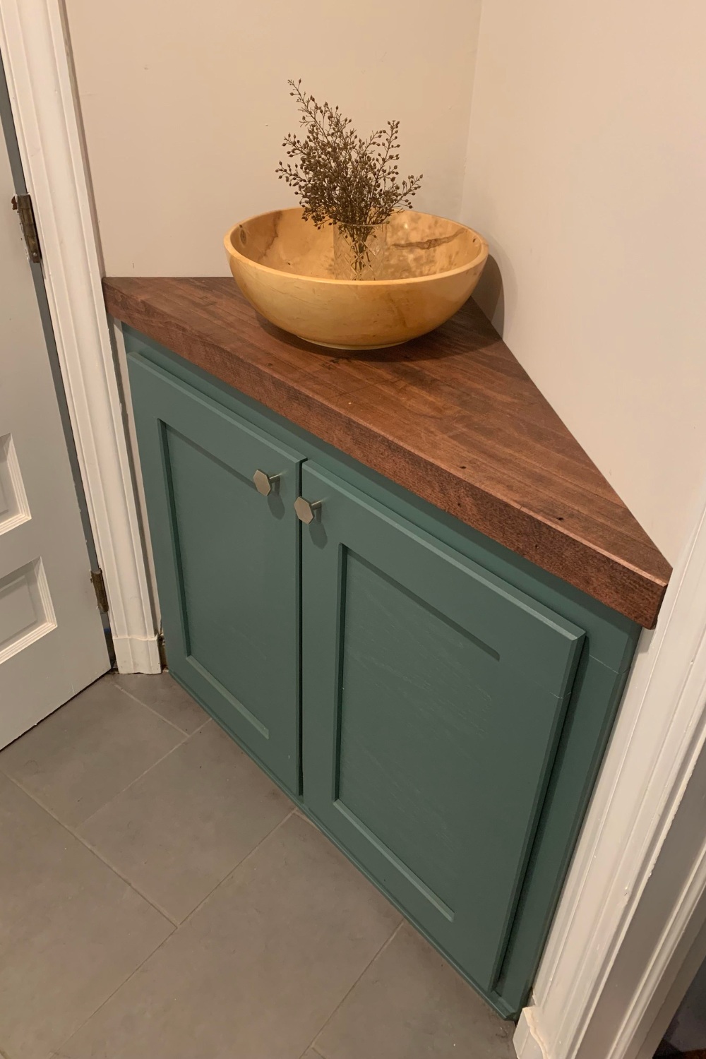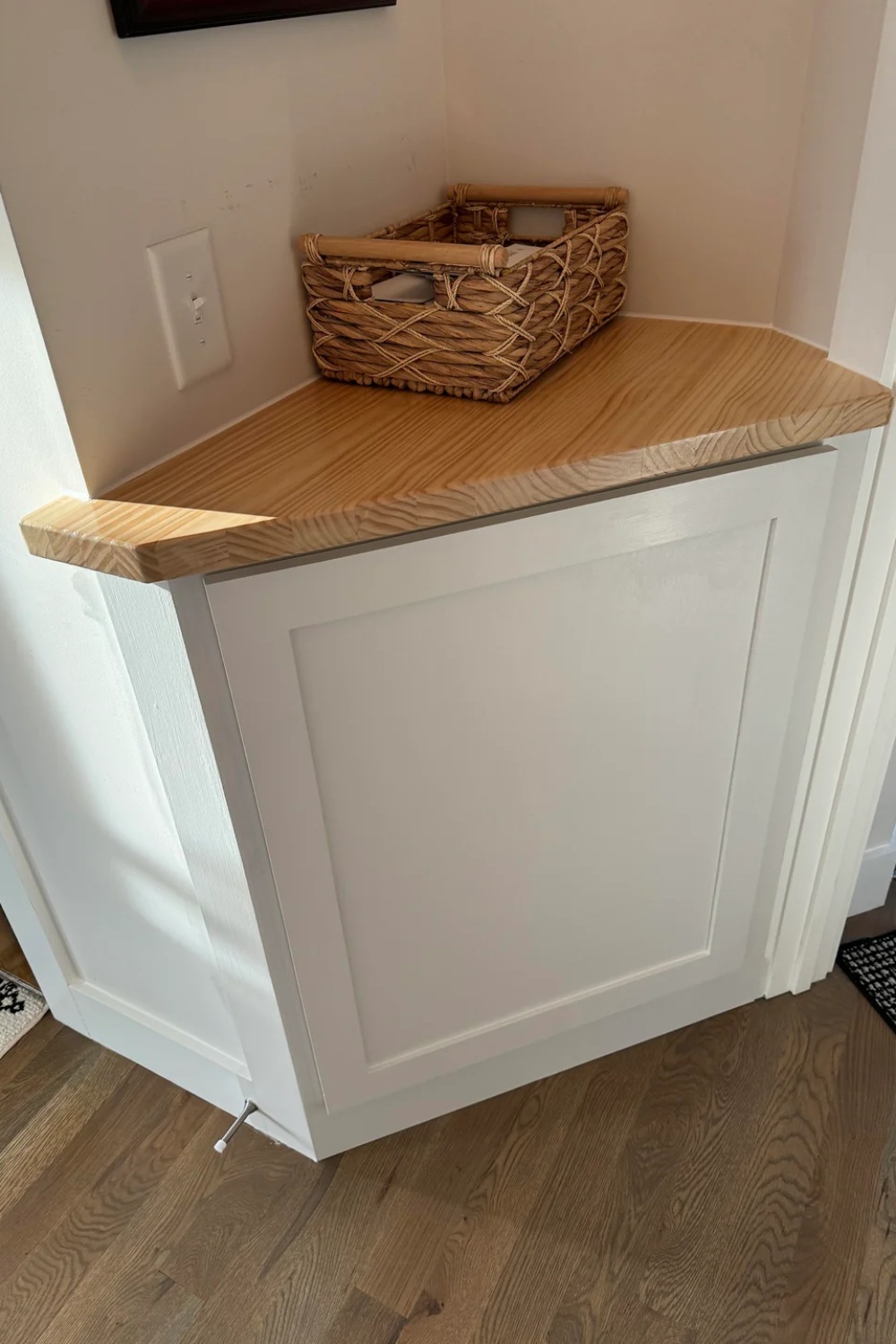 u/Bonza1t also tackled a tricky spot by creating a custom low corner cabinet that honestly looks way better than basic stands. The warm pine top gives it a lovely farmhouse feel and provides a great surface for decorating. Since our walls are never perfectly straight, I love that they used a little caulk to finish off this small DIY project.