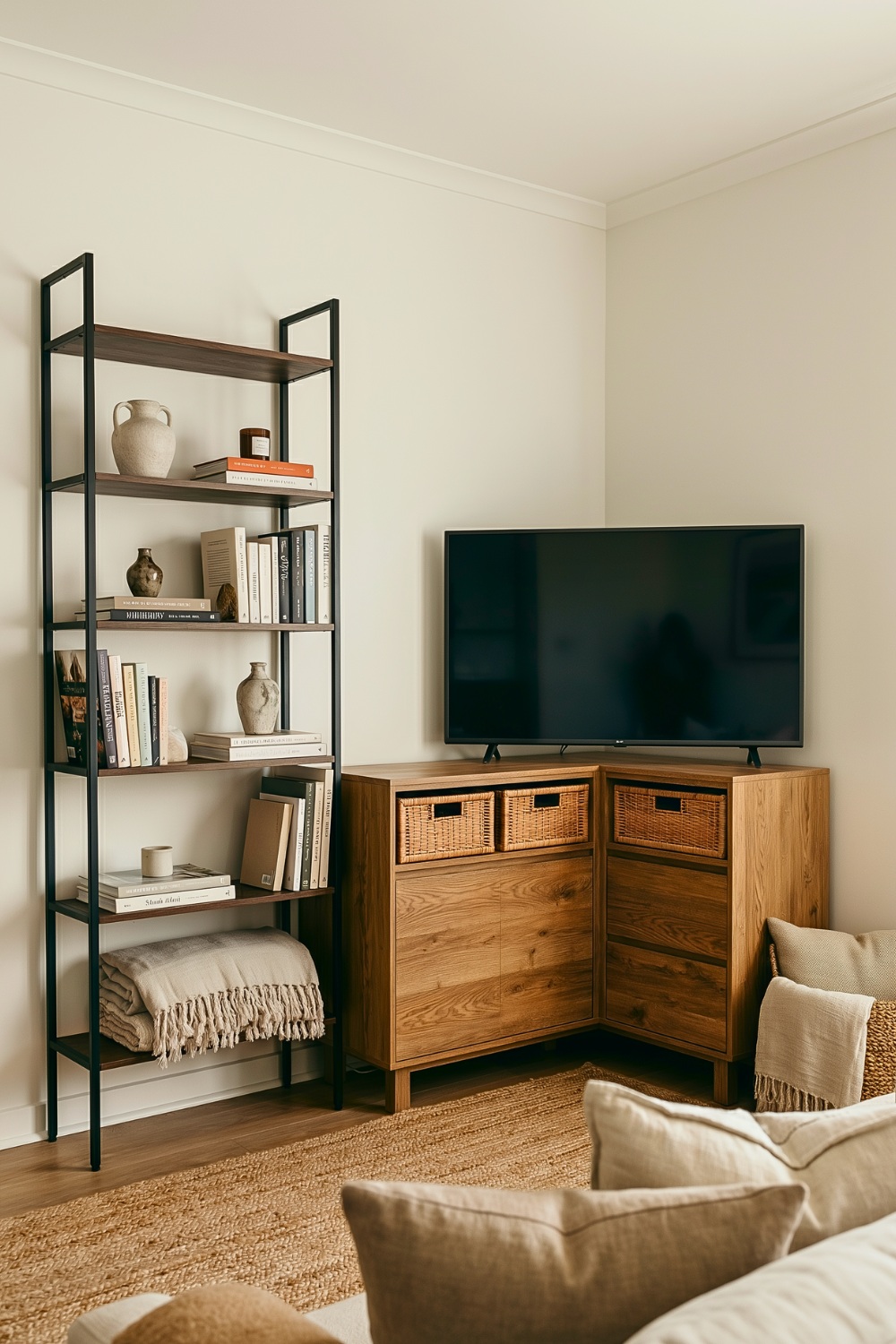For a more relaxed feel, you might like these low-profile farmhouse stands with natural wood textures. I usually suggest using baskets for hidden storage to keep all those messy cables out of sight. Mixing in different heights, like a nearby metal shelf, finishes the decorating without cluttering the room.