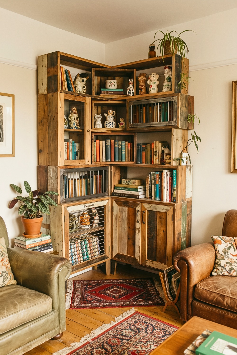 I think a DIY project using reclaimed wood crates is a genius way to fill a corner that standard furniture just can’t handle. You can stack these sturdy boxes to build a tall and quirky display for your book collection and vintage decor pieces. This rustic organization system uses open-slat crates and wire mesh doors to give your home a personalized farmhouse vibe that feels totally one-of-a-kind.