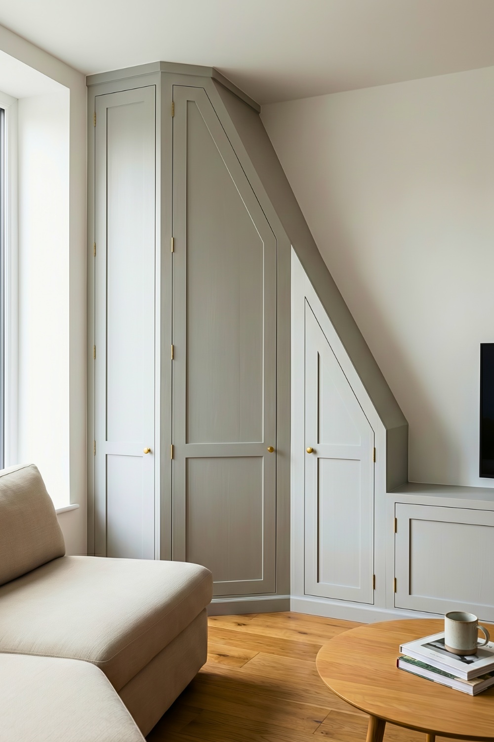 We all have those “dead” zones under stairs or sloped ceilings, right? I recommend using custom wall cabinets that follow the angle of the roof to make that space useful. Picking a neutral grey color keeps a small area looking bright and helps with your overall decorating strategy.