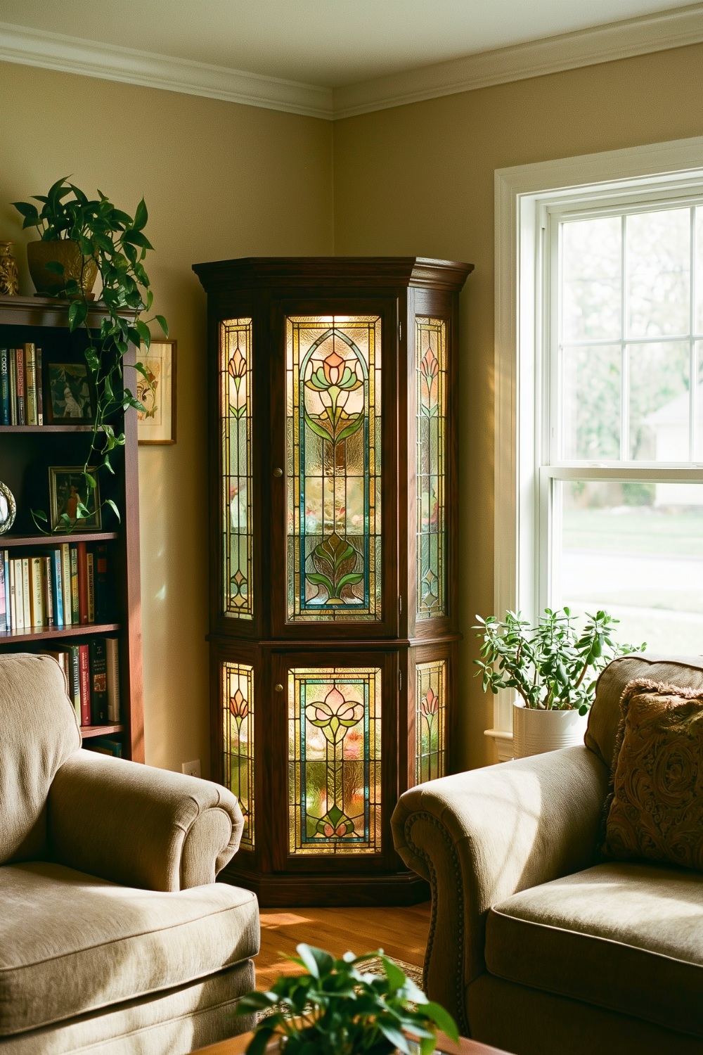 Sometimes a corner needs more than just functionality; it needs a major “wow” factor. This antique style tall cabinet features stunning, illuminated stained glass panels that turn a simple storage piece into a glowing work of art. I think the intricate floral design and warm wood tones make it a perfect focal point for a traditional living room. It’s a brilliant way to add a bit of moody, colorful light to a dim corner while still providing a dedicated spot for your most prized decor.