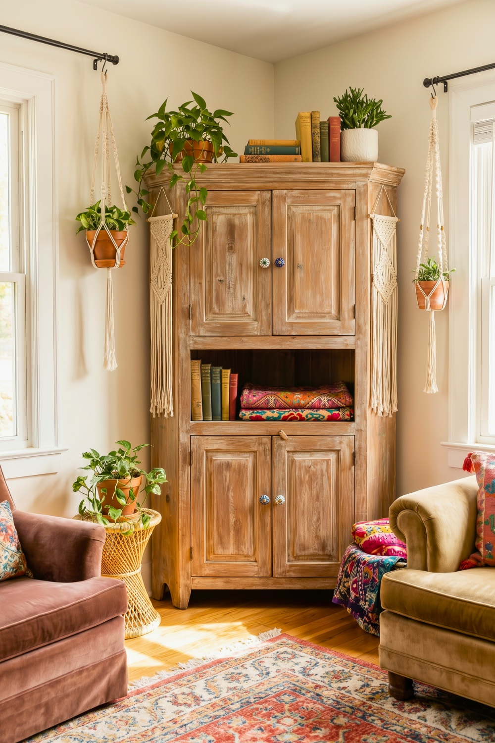 Adding plants can really soften the look of a tall, wooden farmhouse cabinet. I think hanging some macramé planters nearby creates such a cozy vibe for a family room. Using a corner unit for storage of things like blankets and books keeps your small space tidy while looking layered and warm.