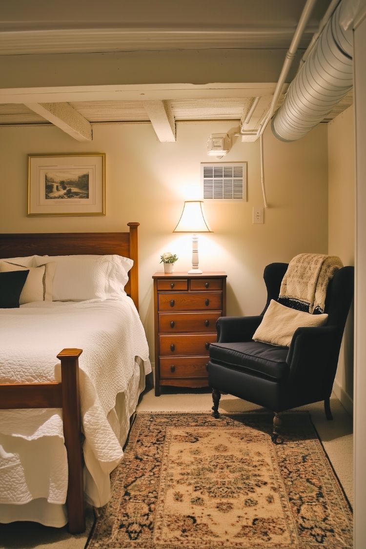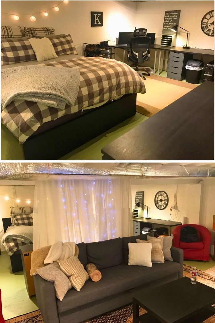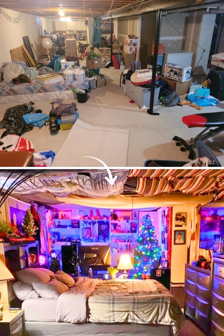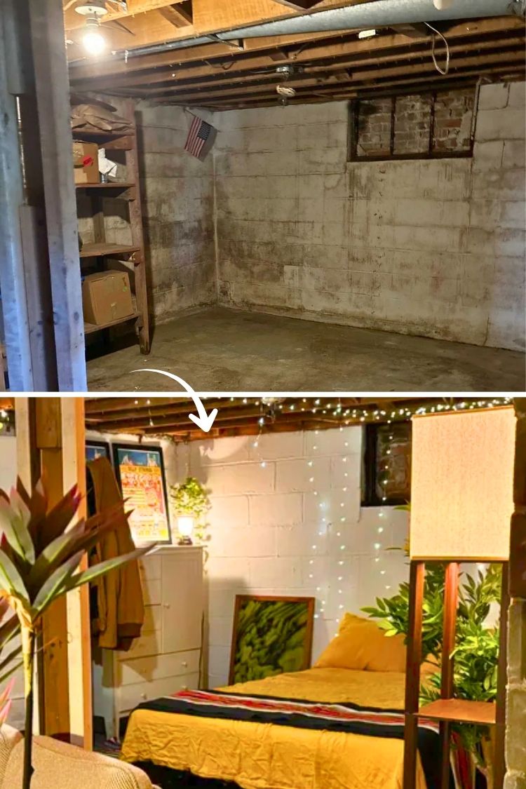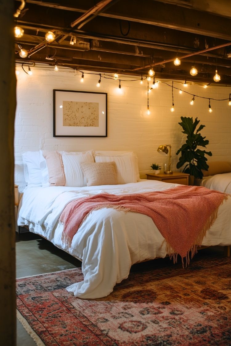 This cozy basement bedroom proves you don’t need windows to create warmth. String lights draped across exposed beams make the space glow. Perfect inspiration if you’re searching for cozy basement bedroom ideas or small basement makeover tips.